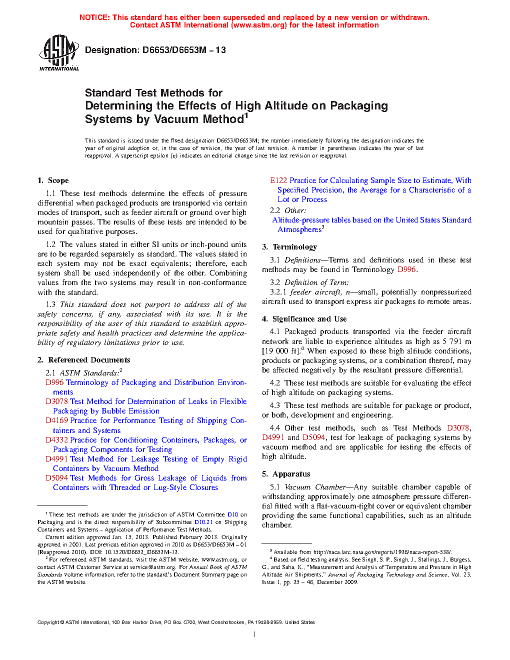 Other test methods, such as Test Methods D3078, D4991 and D5094, test for leakage of packaging systems by vacuum method and are applicable for testing the effects of high altitude.
