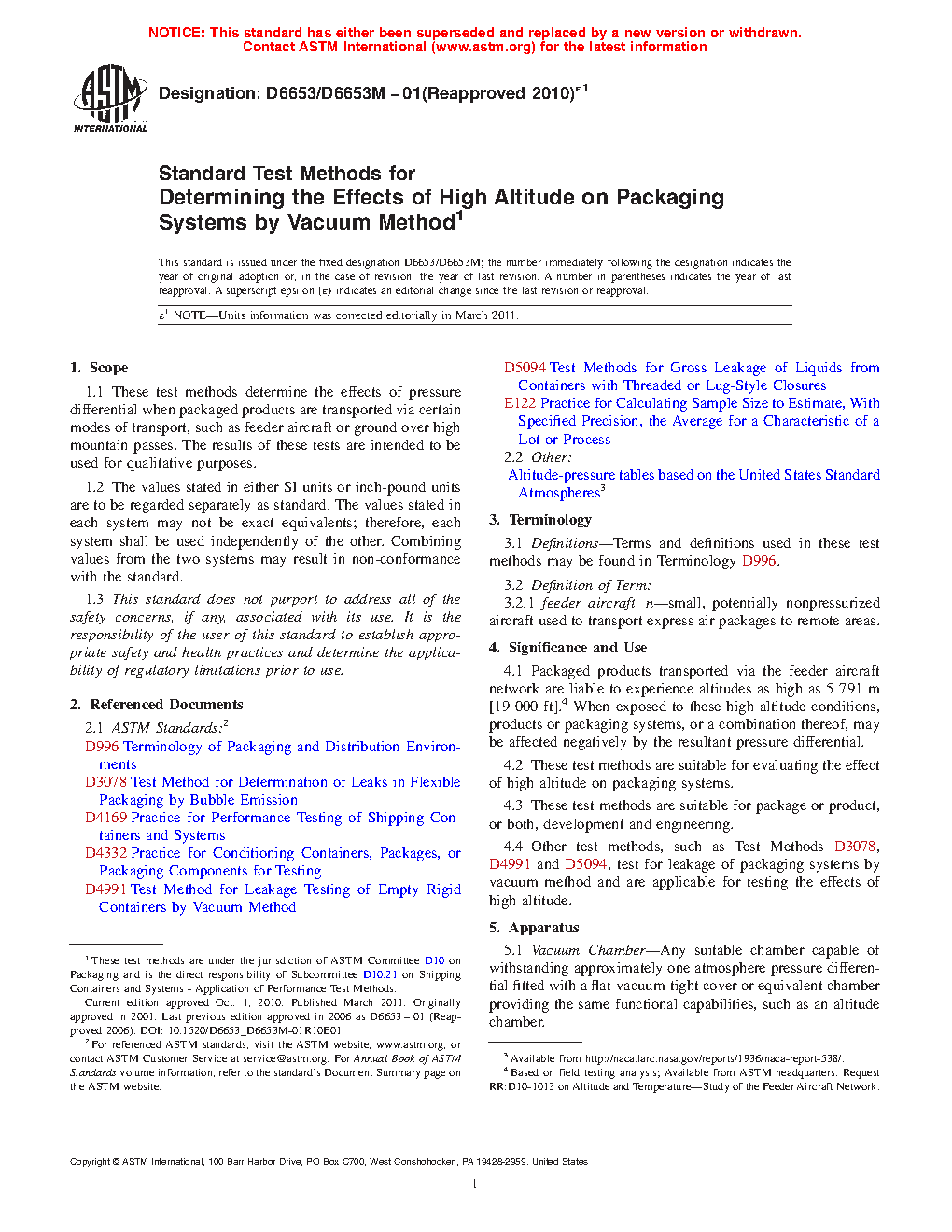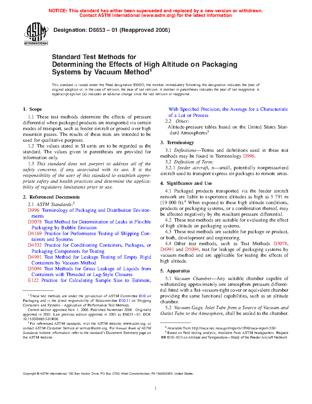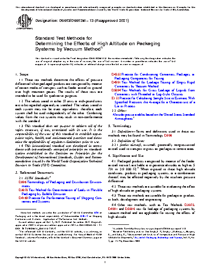 1.1 These test methods determine the effects of pressure differential when packaged products are transported via certain modes of transport, such as feeder aircraft or ground over high mountain passes. The results of these tests are intended to be used for qualitative purposes.