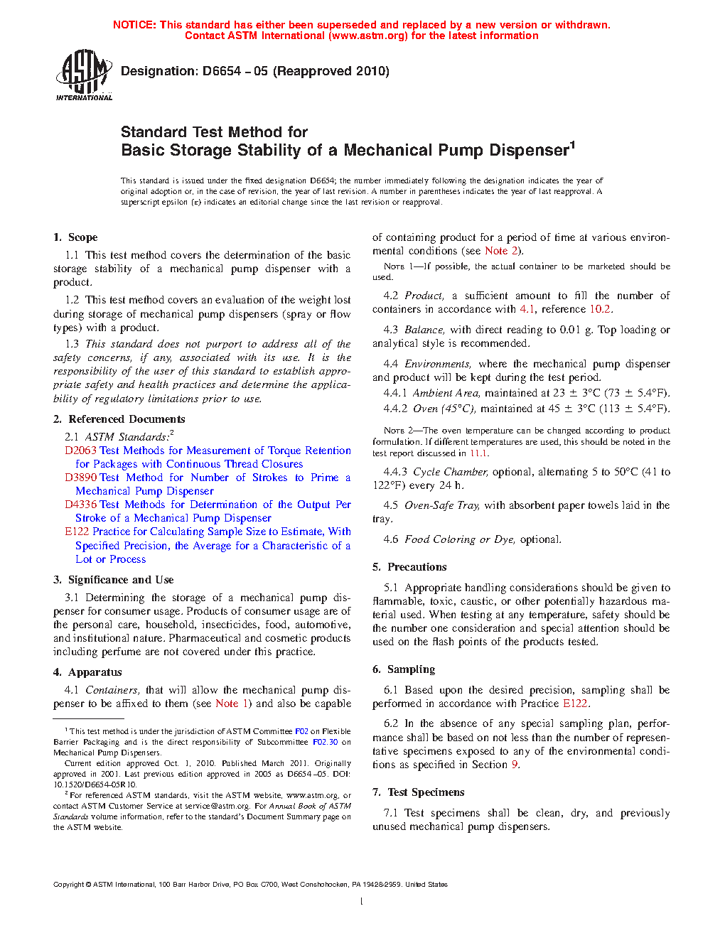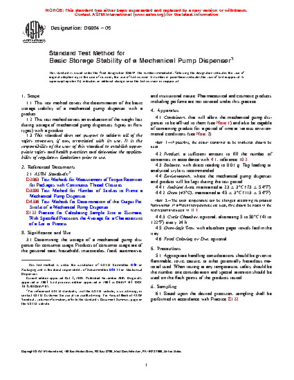Standard Test Method for Basic Storage Stability of a Mechanical Pump Dispenser