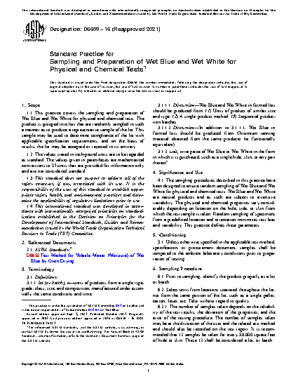 1.1 This practice covers the sampling and preparation of wet blue for physical and chemical tests. The product is grouped into lots that are randomly sampled in such a manner as to produce a representative sample of the lot. This sample may be used to determine compliance of the lot with applicable specification requirements, and on the basis of results, the lot may be accepted or rejected in its entirety.