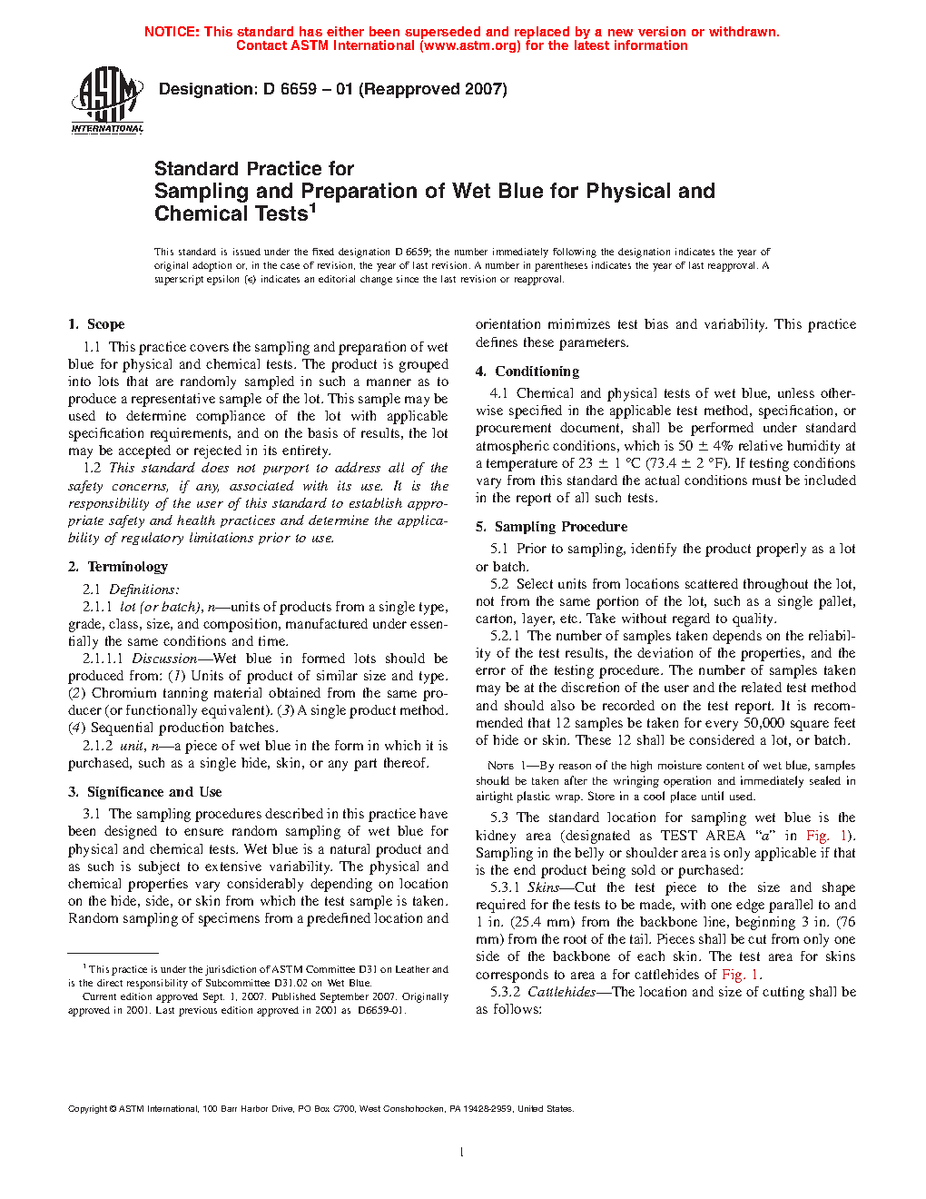 4.1 The sampling procedures described in this practice have been designed to ensure random sampling of wet blue for physical and chemical tests. Wet blue is a natural product and as such is subject to extensive variability. The physical and chemical properties vary considerably depending on location on the hide, side, or skin from which the test sample is taken. Random sampling of specimens from a predefined location and orientation minimizes test bias and variability. This practice defines these parameters.