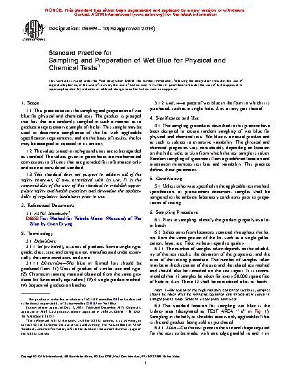 1.1 This practice covers the sampling and preparation of wet blue for physical and chemical tests. The product is grouped into lots that are randomly sampled in such a manner as to produce a representative sample of the lot. This sample may be used to determine compliance of the lot with applicable specification requirements, and on the basis of results, the lot may be accepted or rejected in its entirety.