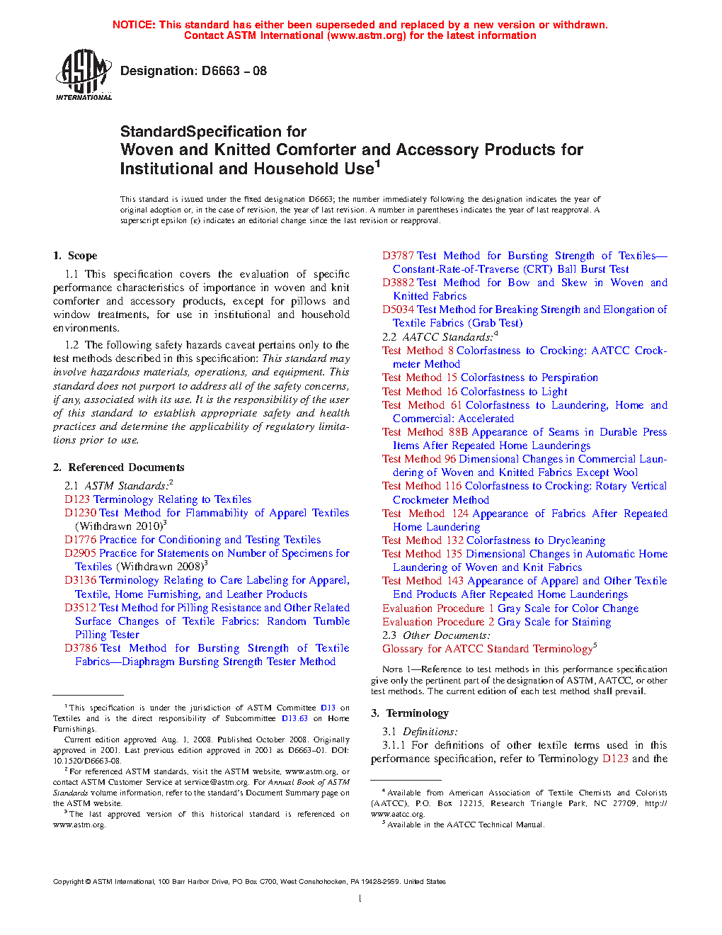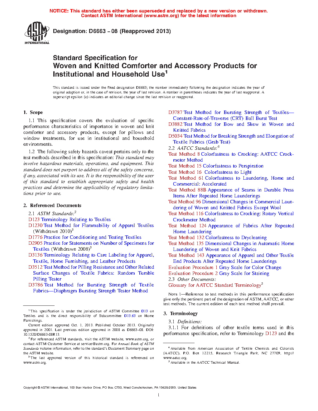 1.1 This specification covers the evaluation of specific performance characteristics of importance in woven and knit comforter and accessory products, except for pillows and window treatments, for use in institutional and household environments.