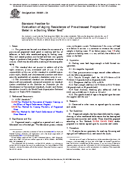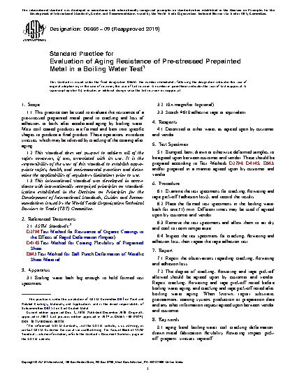 1.1 This practice can be used to evaluate the resistance of a pre-stressed prepainted metal panel to cracking and loss of adhesion, or both, after accelerated aging by boiling water. Most coil coated products are formed and bent into specific shapes to produce a final product. These operations introduce stresses, which may be relieved by cracking of the coating after aging.