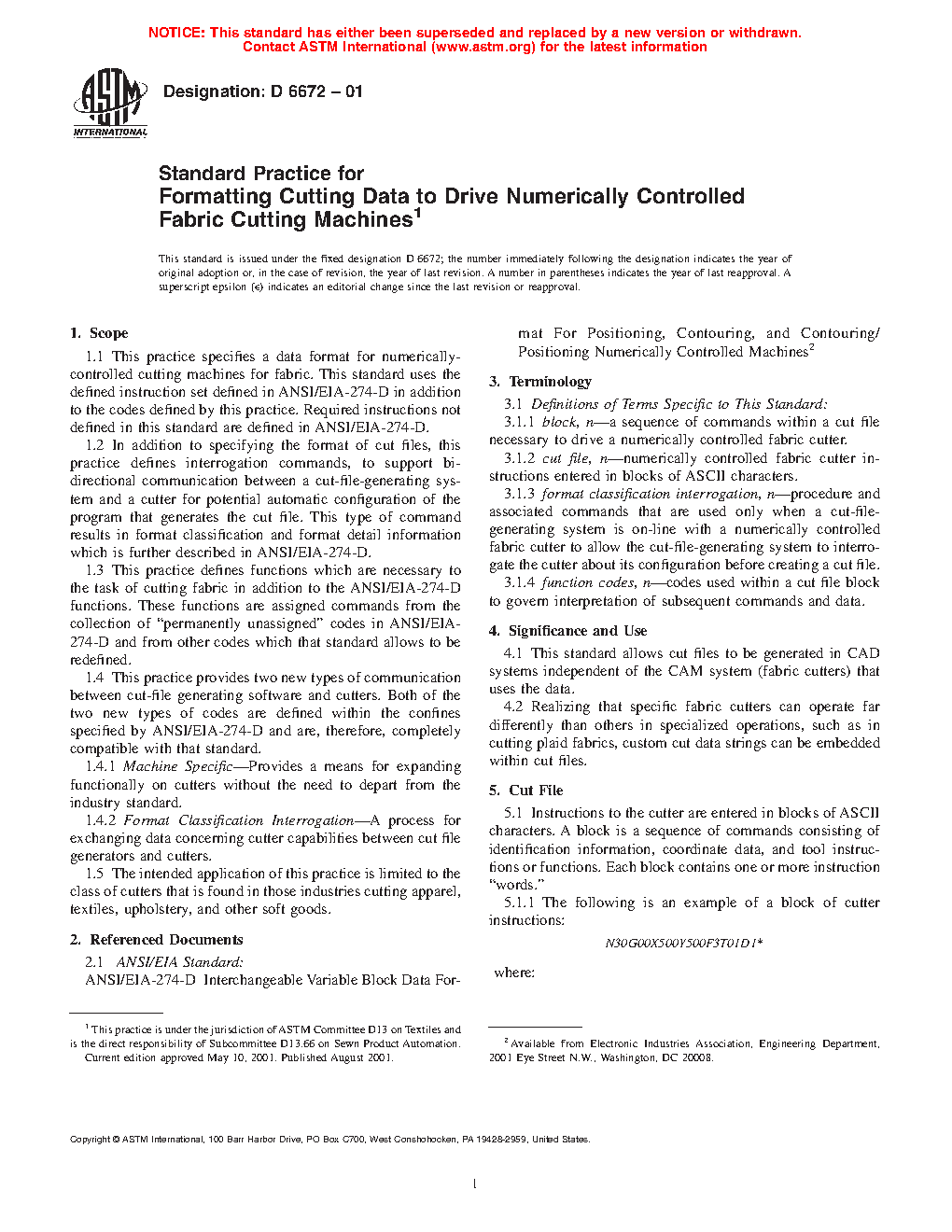 1.1 This practice specifies a data format for numerically-controlled cutting machines for fabric.