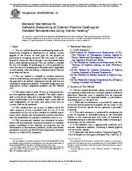 1.1 This test method describes an accelerated procedure for determining comparative characteristics of coating systems applied to the exterior of steel pipe for the purpose of preventing or mitigating corrosion that may occur in underground or immersion where the pipe is carrying heated media and is under cathodic protection. This test method is intended for use with samples of coated pipe, or with a specimen cut from the section of coated pipe or flat plates, and is applicable to such samples when the coating is characterized by function as an electrical barrier.