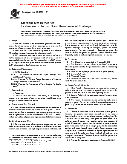 5.1 Tannins and other chromophoric extractives are naturally occurring materials in wood and wood-based substrates. Tannins are prevalent to a high degree in cedar, redwood, oak and to a lesser degree in white and yellow pine. Tannins are also present in varying amounts in wood composition products. These extractives are solubilized and darkened in color by aqueous coatings, resulting in unsightly yellow or brown discolorations. This test method is designed to show the relative ability of paints to prevent tannin bleed-through. Typically cedar or redwood panels are used for this test.