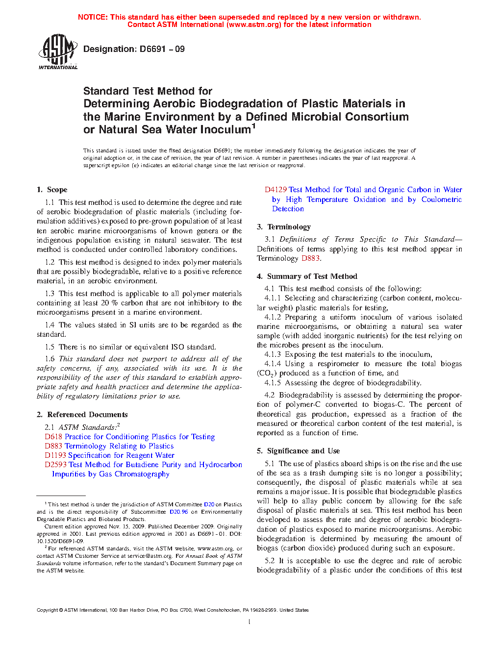 5.1 The use of plastics aboard ships is on the rise and the use of the sea as a trash dumping site is no longer a possibility; consequently, the disposal of plastic materials while at sea remains a major issue. It is possible that biodegradable plastics will help to allay public concern by allowing for the safe disposal of plastic materials at sea. This test method has been developed to assess the rate and degree of aerobic biodegradation of plastics exposed to marine microorganisms. Aerobic biodegradation is determined by measuring the amount of biogas (carbon dioxide) produced during such an exposure.