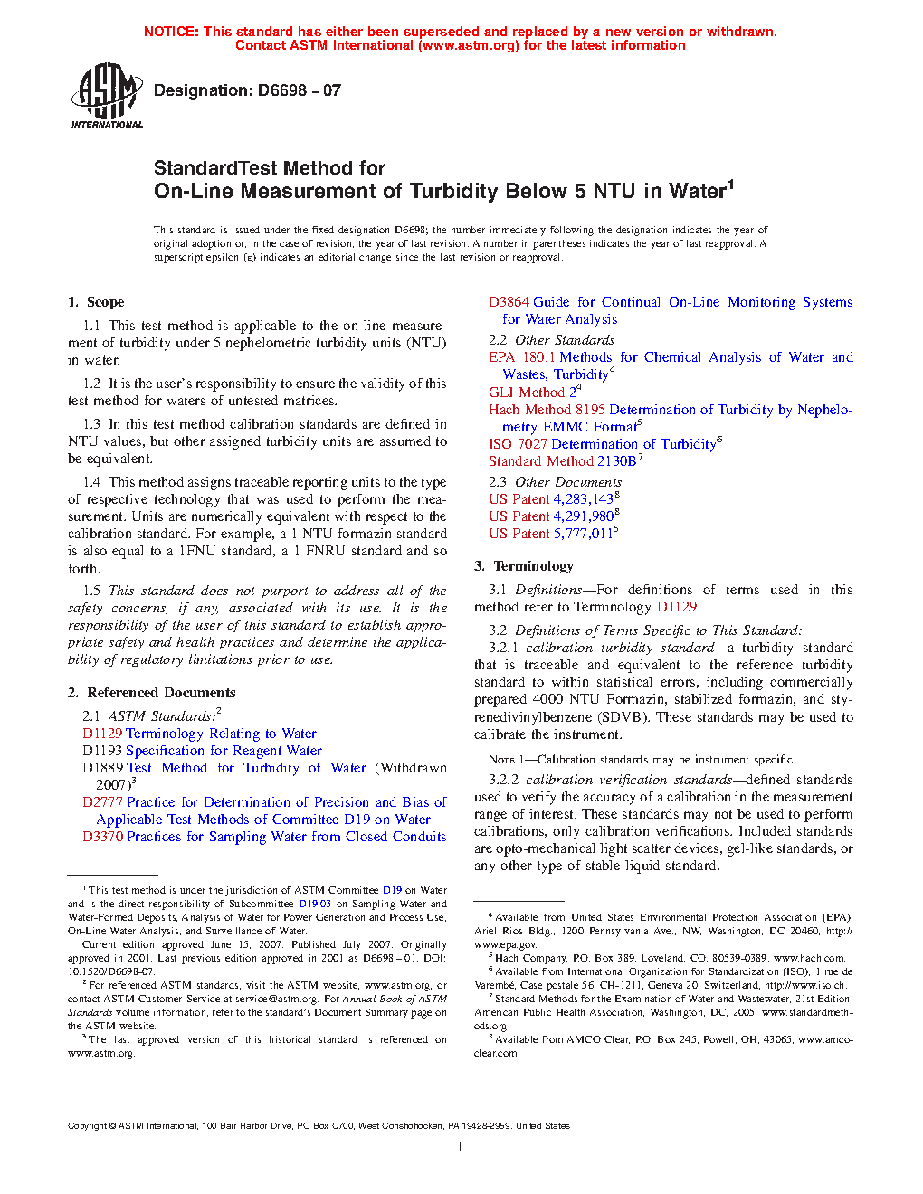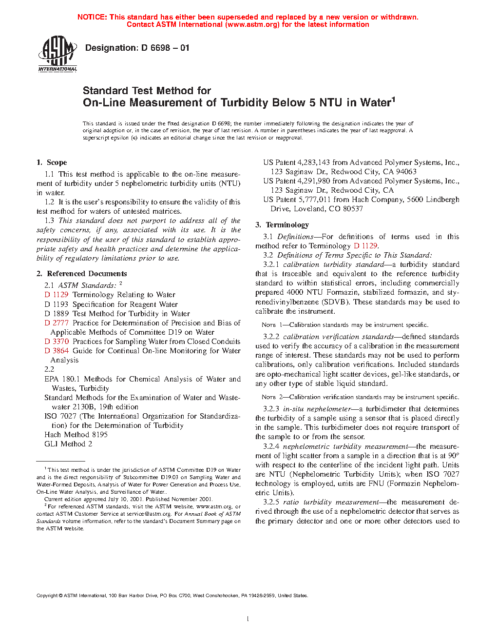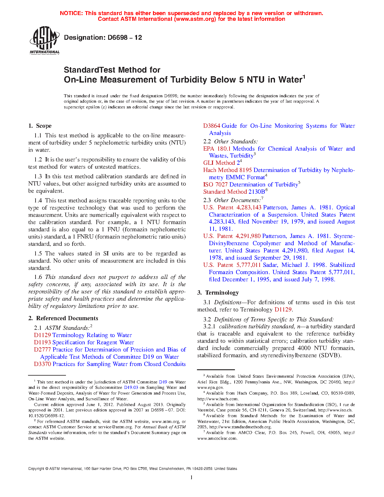 1.1 This test method is applicable to the on-line measurement of turbidity under 5 nephelometric turbidity units (NTU) in water.