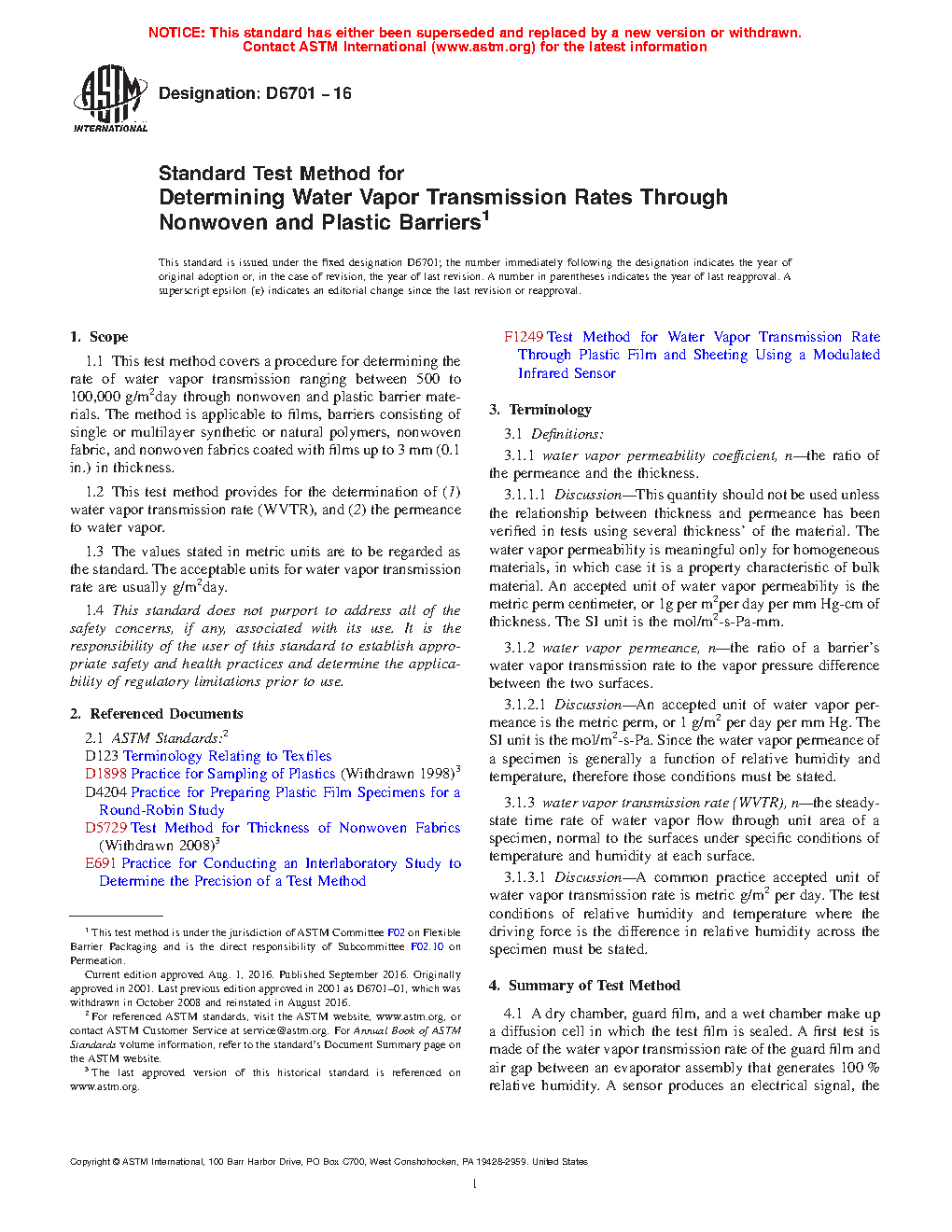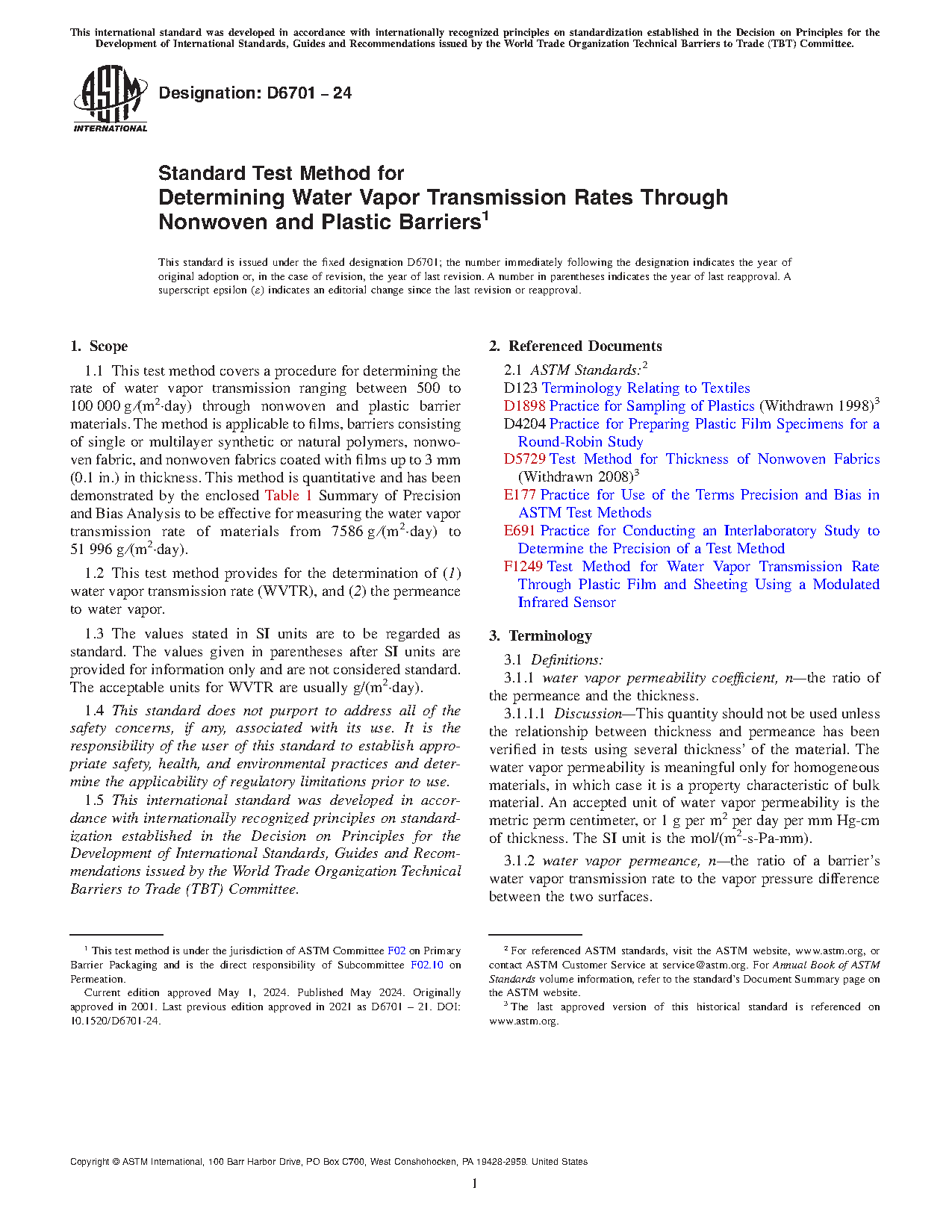 1.2 This test method provides for the determination of (1) water vapor transmission rate (WVTR), and (2) the permeance to water vapor.