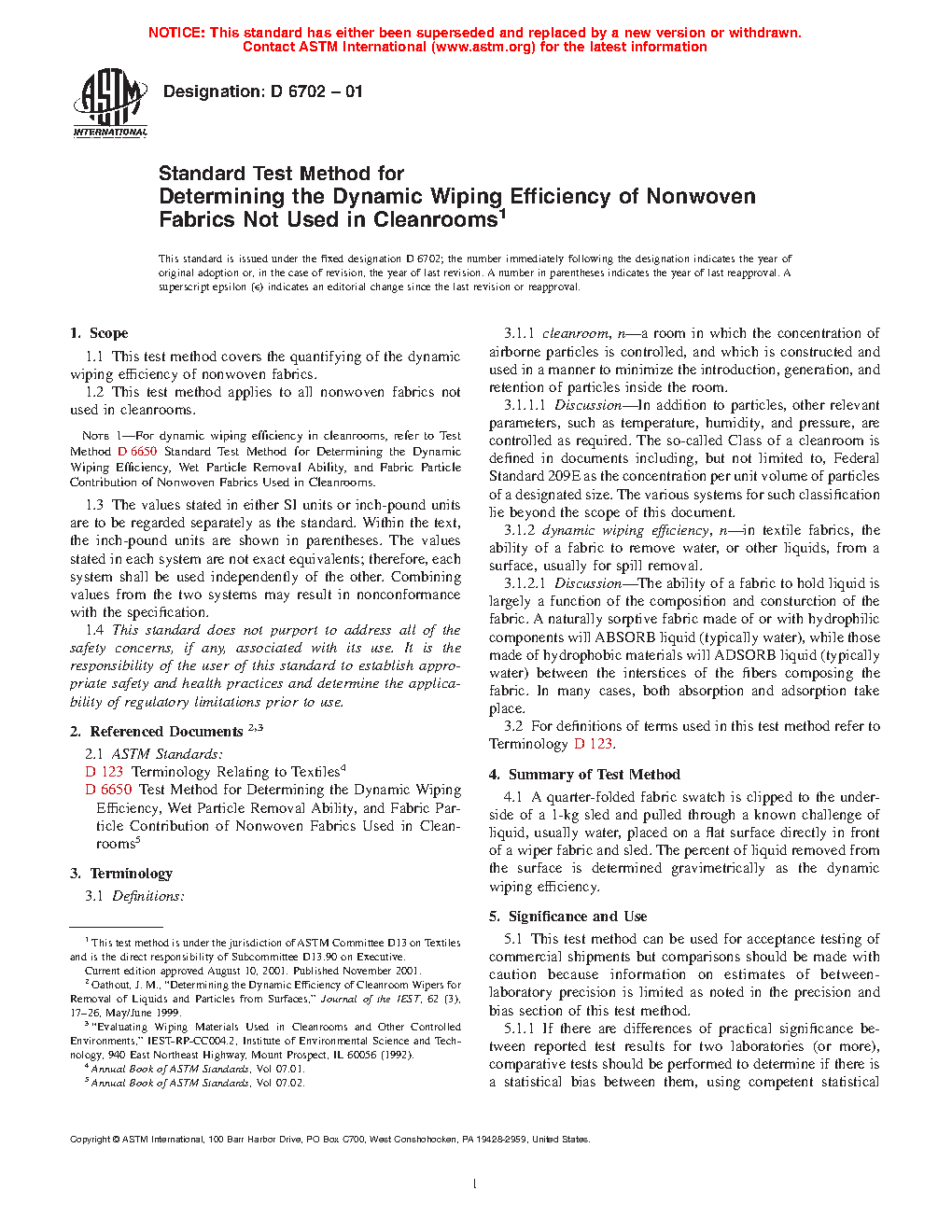 Note 1—For dynamic wiping efficiency in cleanrooms, refer to Test Method D 6650 Standard Test Method for Determining the Dynamic Wiping Efficiency, Wet Particle Removal Ability, and Fabric Particle Contribution of Nonwoven Fabrics Used in Cleanrooms.