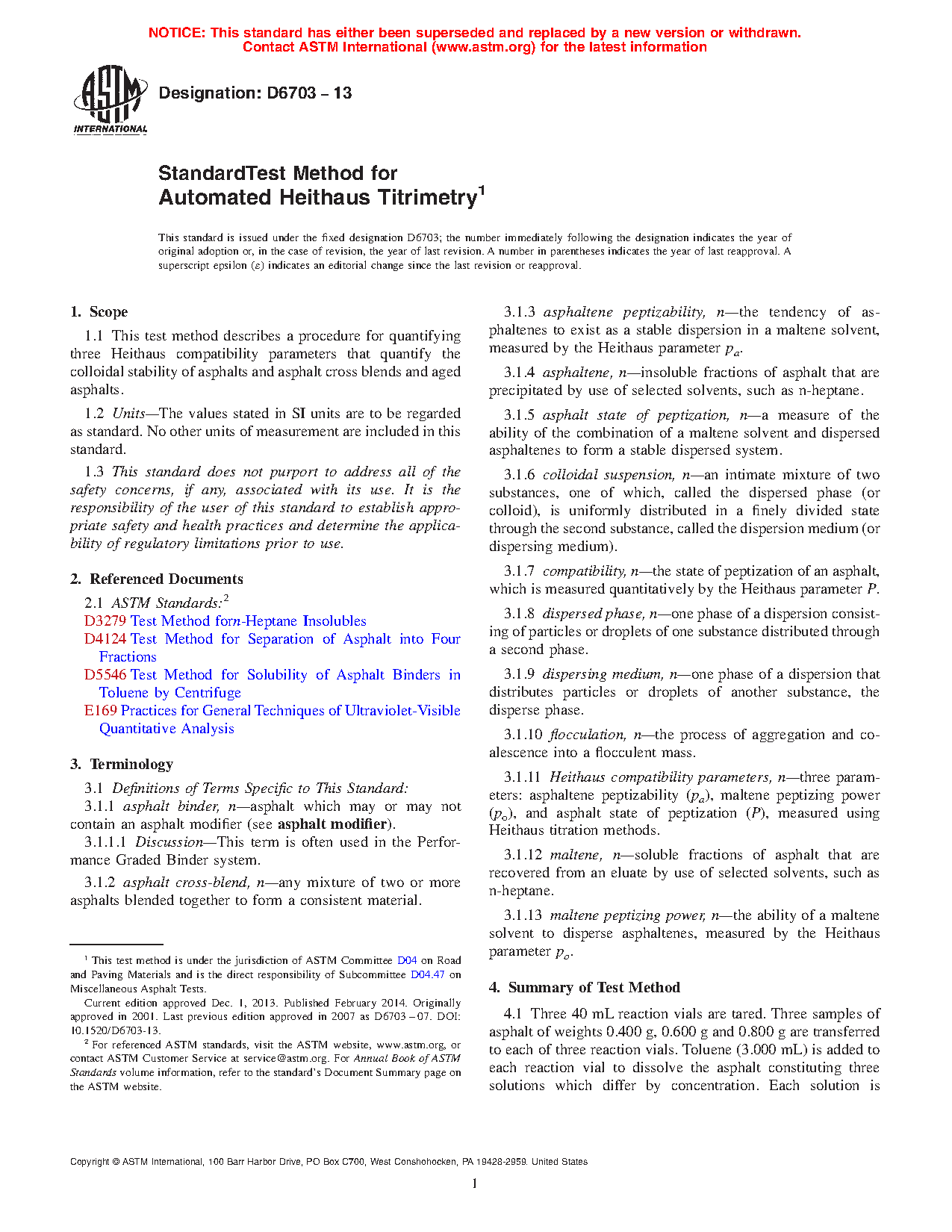 5.1 This test method is intended primarily as a laboratory diagnostic tool for estimating the colloidal stability of bitumen asphalt, asphalt cross blends, aged asphalt, and heavy oil residuum. Historically, bituminous asphalt and heavy oil residua have been modeled as colloidal suspensions in which a polar associated asphaltene moiety (the dispersed phase) is suspended in a maltene solvent moiety (the dispersing medium) (refer to Test Methods D3279, D4124, and D5546 for further definition of asphalt fraction materials). The extent to which these two moieties remain in state of peptization is a measure of the compatibility (colloidal stability) of the suspension. Compatibility influences the physical properties of these materials, including rheological properties, for example, phase angle and viscosity. This test method and other similar test methods, along with the classical Heithaus test, measures the overall compatibility of a colloidal system by determining a parameter referred to as the state of peptization, P. The value of P commonly varies between 2.5 to 10 for unmodified or neat asphalts. Materials calculated to have low values of P are designated incompatible. Materials calculated to have high P values are designated compatible. Values in P are calculated as a function of two parameters that relate to the peptizability of the asphaltene moiety (the asphaltene peptizability parameter, pa) and the solvent power of the maltene moiety (the maltene peptizing power parameter, po). Values of pa and po are calculated as functions of the quantities Cmin and FRmax. Values of Cmin and FRmax are determined from experimental variables, the weight of asphalt (Wa), the volume of solvent (VS) to dissolve the weight of asphalt, and the volume of titrant (VT) added to initiate flocculation.
