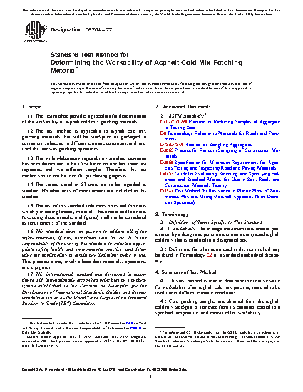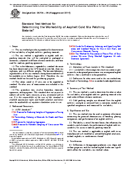 1.1 This test method provides a procedure for determination of the workability of asphalt cold mix patching materials.