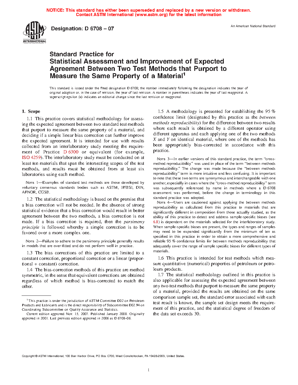 1.7 The statistical methodology outlined in this practice is also applicable for assessing the expected agreement between any two test methods that purport to measure the same property of a material, provided the results are obtained on the same comparison sample set, the standard error associated with each test result is known, the sample set design meets the requirement of this practice, and the statistical degree of freedom of the data set exceeds 30.