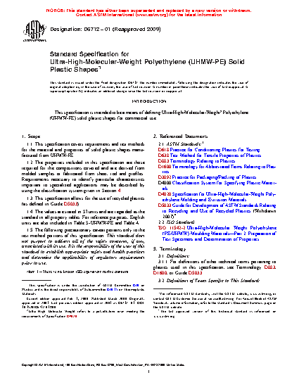 1.1 This specification covers requirements and test methods for the material and properties of solid plastic shapes manufactured from UHMW-PE.