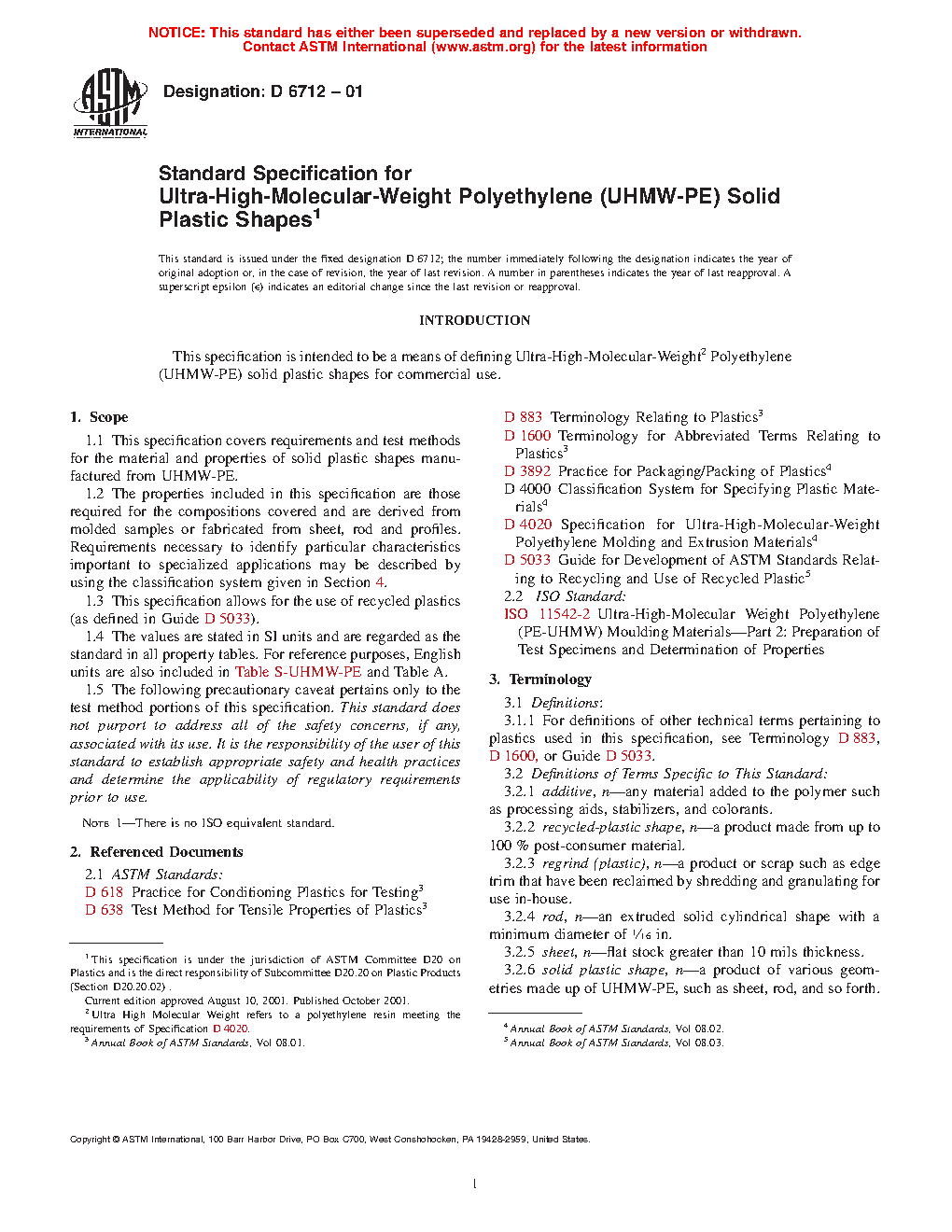 This specification focuses on the classification, and requirements and test methods for the material and properties of solid plastic shapes manufactured from ultra-high-molecular-weight polyethylene (UHMW-PE), both virgin and recycled. The properties included in this specification are those required for the compositions covered and are derived from molded samples or fabricated from sheet, rod and profiles. The mechanical properties for which the materials shall be tested on and shall accordingly adhere to are elongation stress, elongation at break, and Izod impact strength.