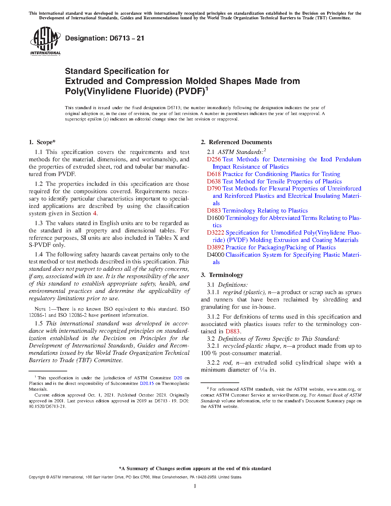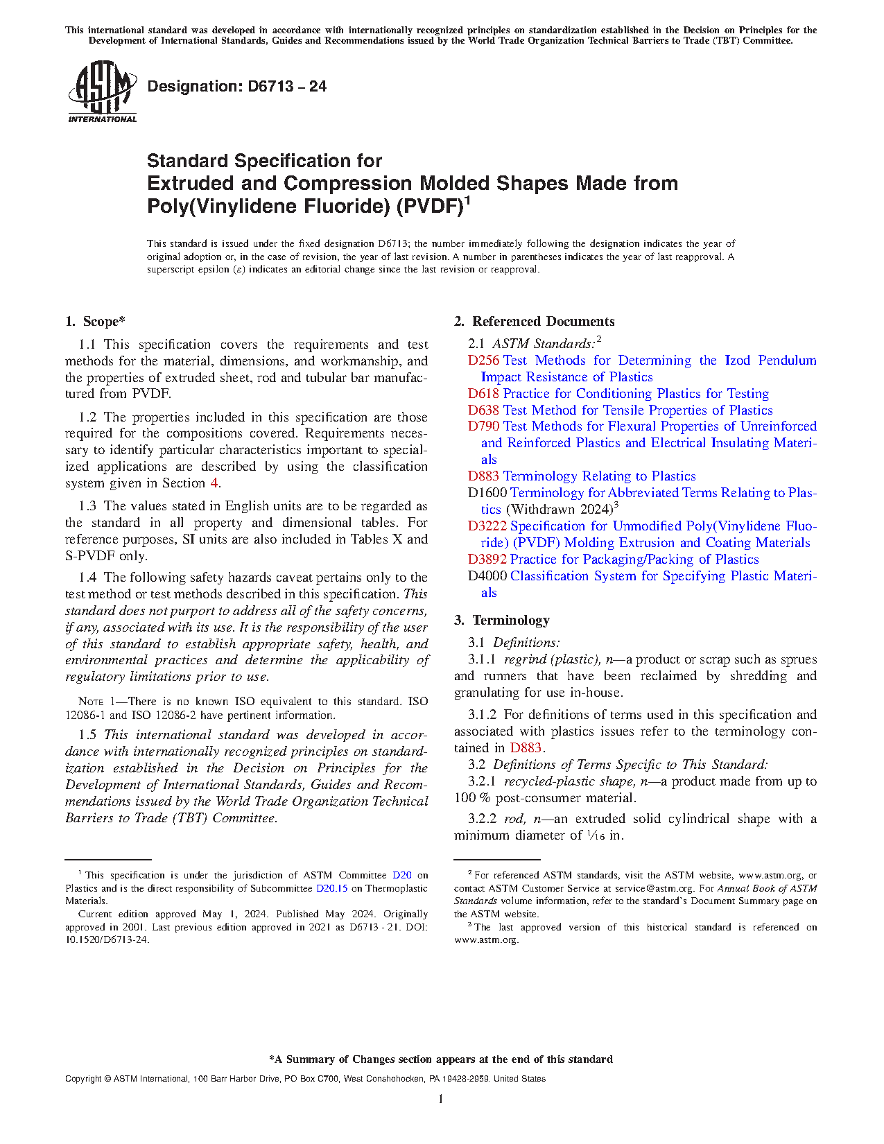 1.1 This specification covers the requirements and test methods for the material, dimensions, and workmanship, and the properties of extruded sheet, rod and tubular bar manufactured from PVDF.