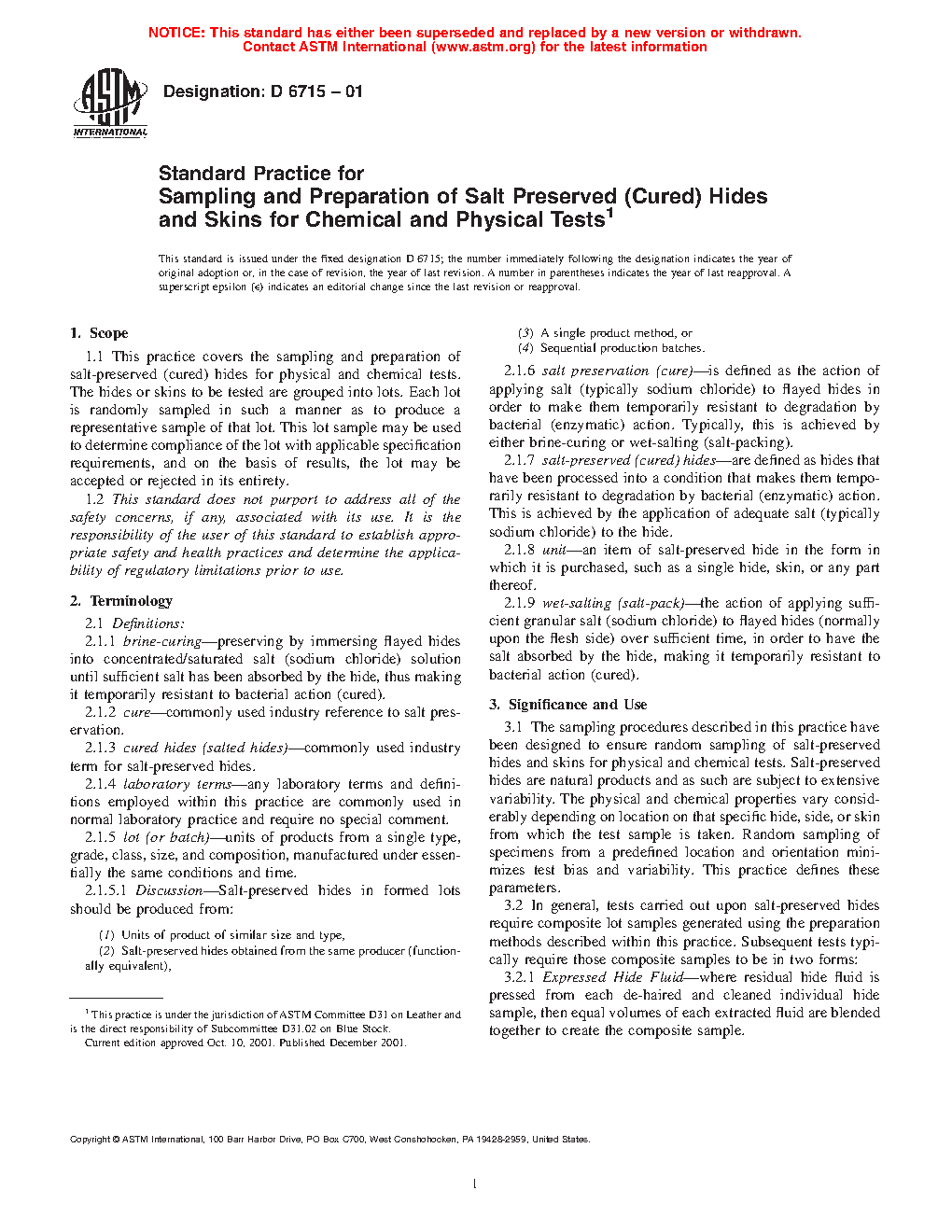 Standard Practice for Sampling and Preparation of Salt Preserved (Cured) Hides and Skins for Chemical and Physical Tests