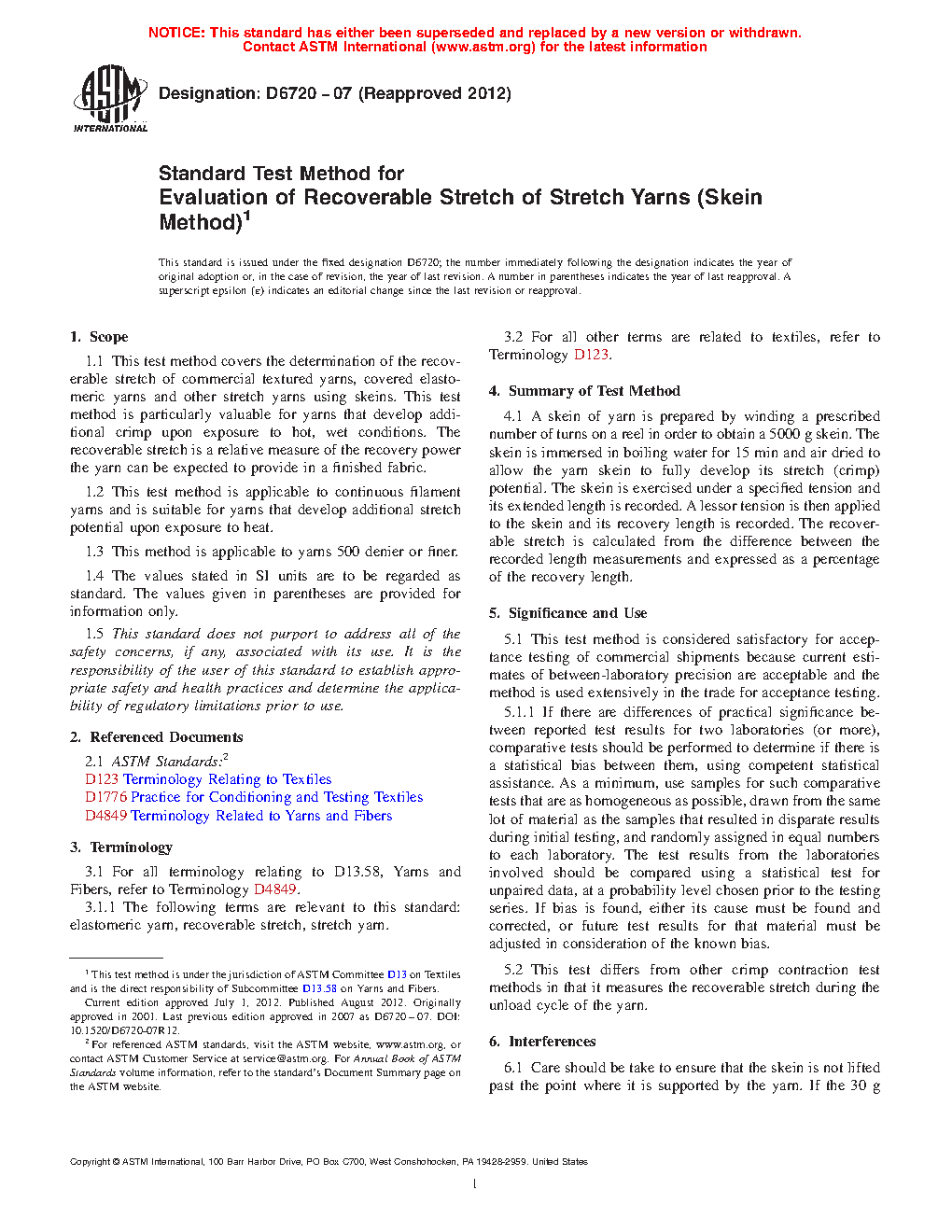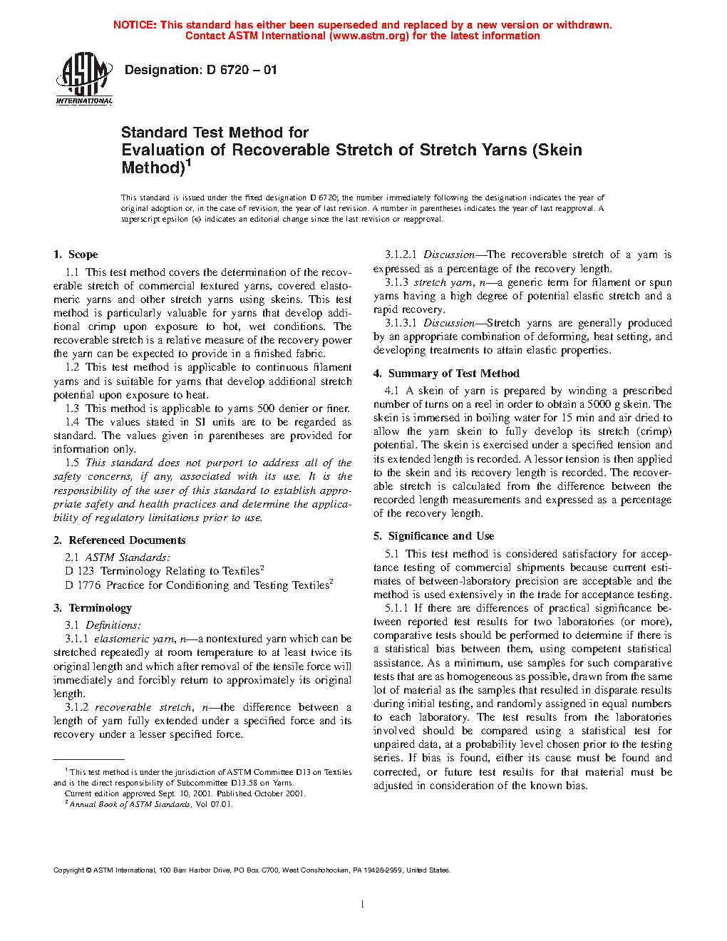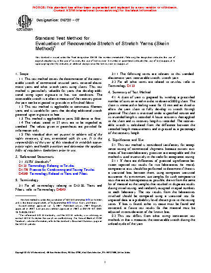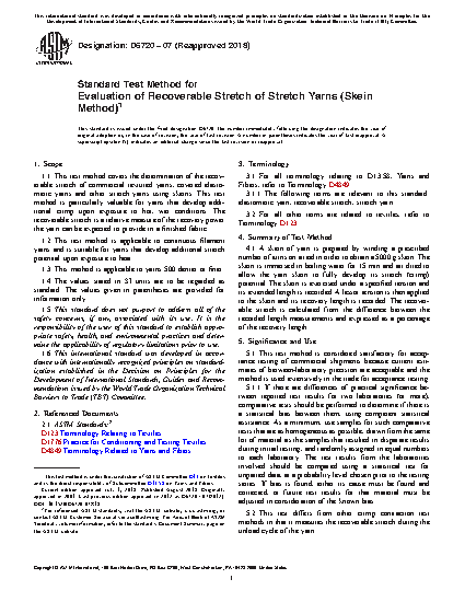 1.1 This test method covers the determination of the recoverable stretch of commercial textured yarns, covered elastomeric yarns and other stretch yarns using skeins. This test method is particularly valuable for yarns that develop additional crimp upon exposure to hot, wet conditions. The recoverable stretch is a relative measure of the recovery power the yarn can be expected to provide in a finished fabric.