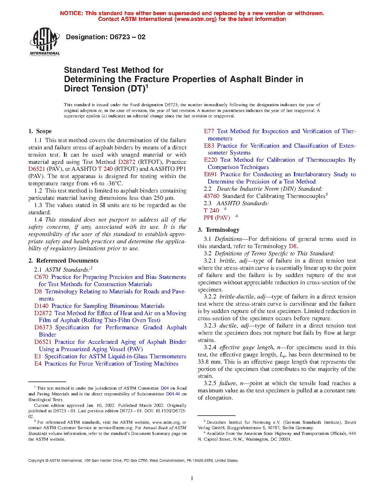 1.1 This test method covers the determination of the failure strain and failure stress of asphalt binders by means of a direct tension test. It can be used with unaged material or with material aged using Test Method D2872 (RTFOT), Practice D6521 (PAV), or AASHTO T240 (RTFOT) and AASHTO PP1 (PAV). The test apparatus is designed for testing within the temperature range from +6 to -36°C.