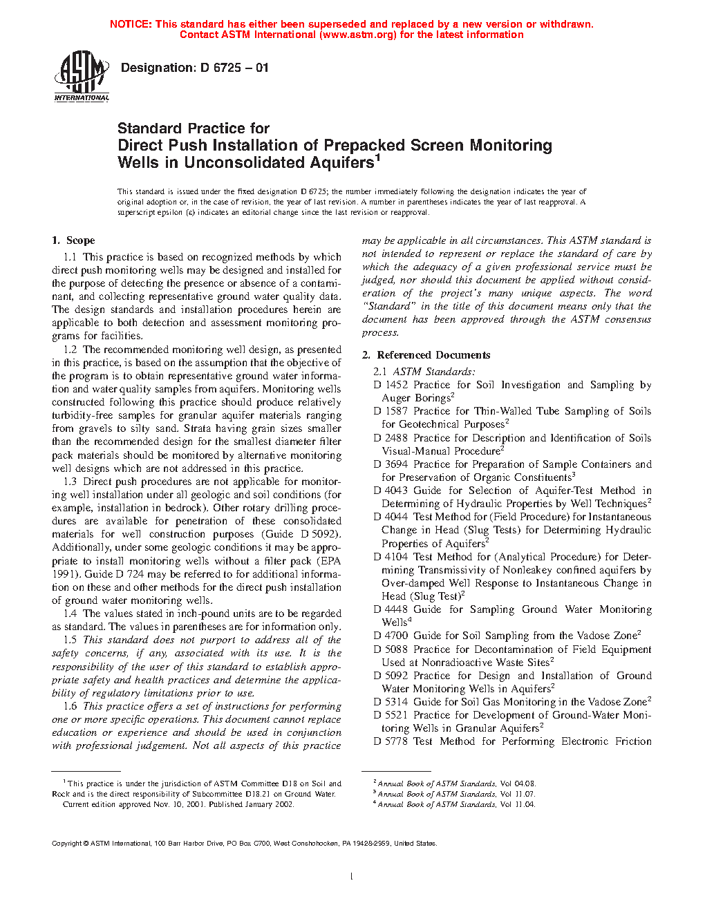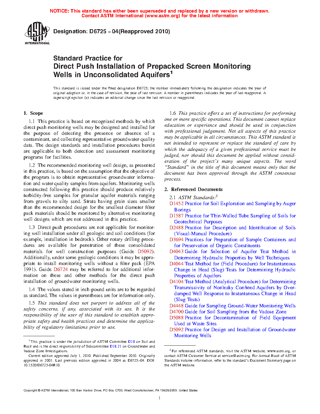 This practice is intended to provide the user with information on the appropriate methods and procedures for installing prepacked screen monitoring wells by direct push methods. The monitoring wells may be used to obtain representative water quality samples for aqueous phase contaminants or other analytes of interest, either organic or inorganic (Kram et al. 2000, McCall 2000, McCall et al. 1997). The monitoring wells may also be used to obtain information on the potentiometric surface of the local aquifer and properties of the formation such as hydraulic conductivity or transmissivity.