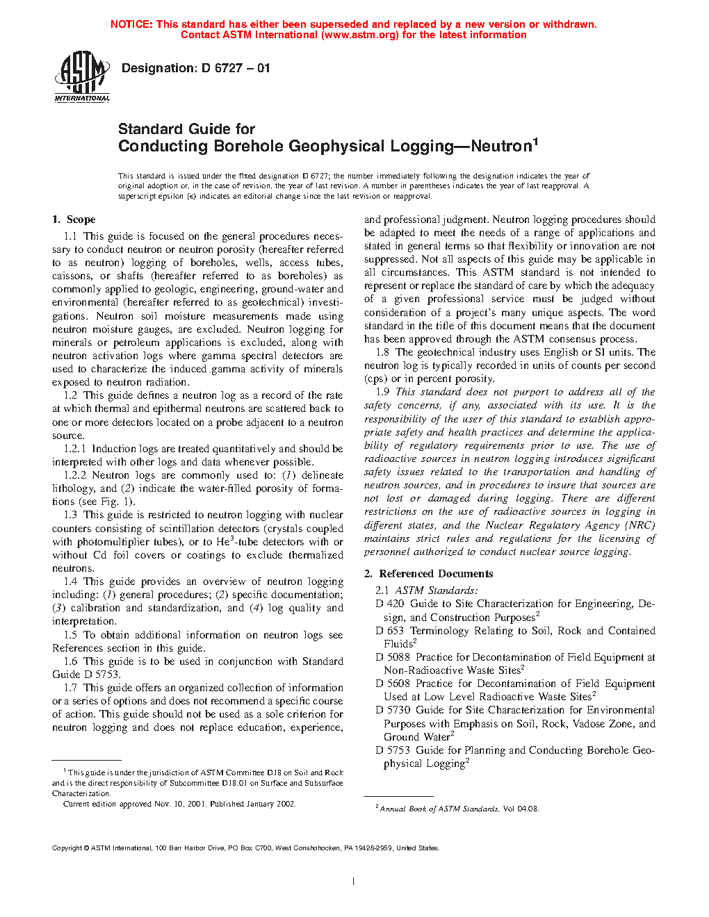 1.1 This guide is focused on the general procedures necessary to conduct neutron or neutron porosity (hereafter referred to as neutron) logging of boreholes, wells, access tubes, caissons, or shafts (hereafter referred to as boreholes) as commonly applied to geologic, engineering, groundwater and environmental (hereafter referred to as geotechnical) investigations. Neutron soil moisture measurements made using neutron moisture gauges, are excluded. Neutron logging for minerals or petroleum applications is excluded, along with neutron activation logs where gamma spectral detectors are used to characterize the induced gamma activity of minerals exposed to neutron radiation.