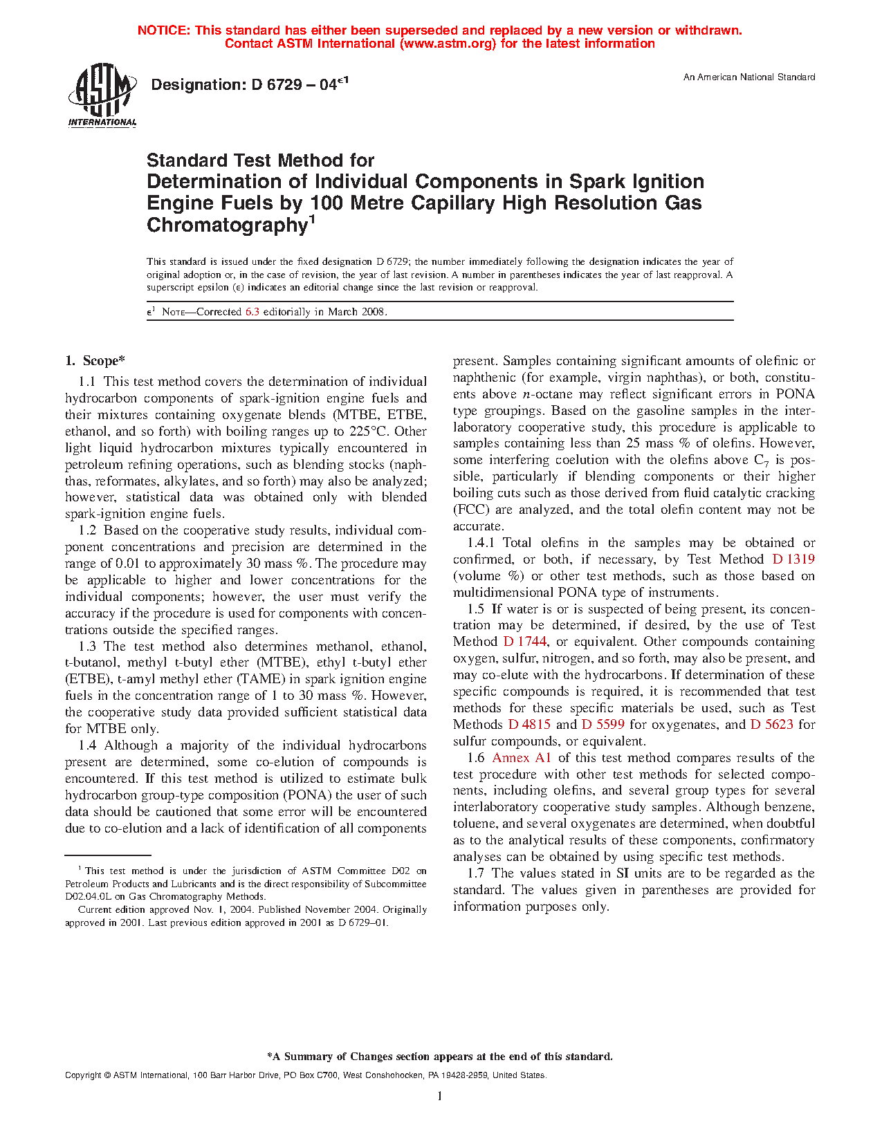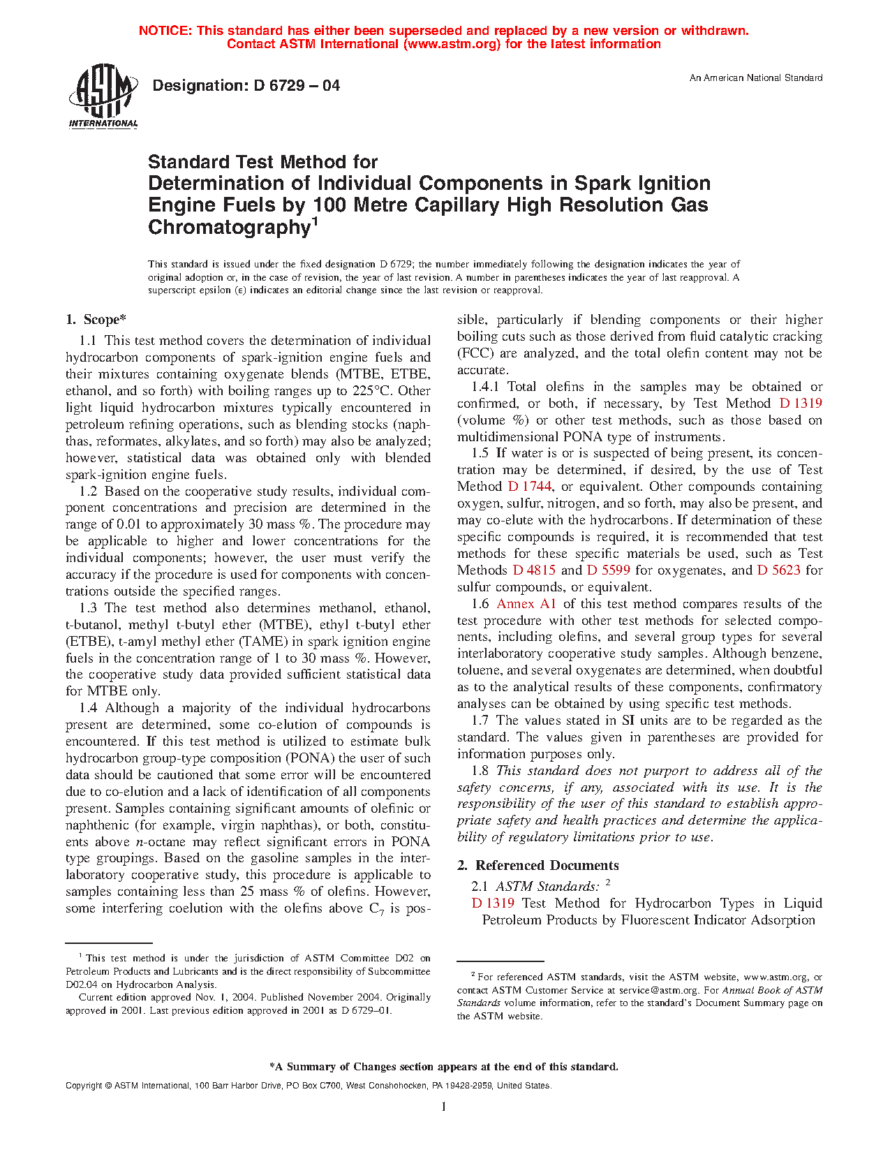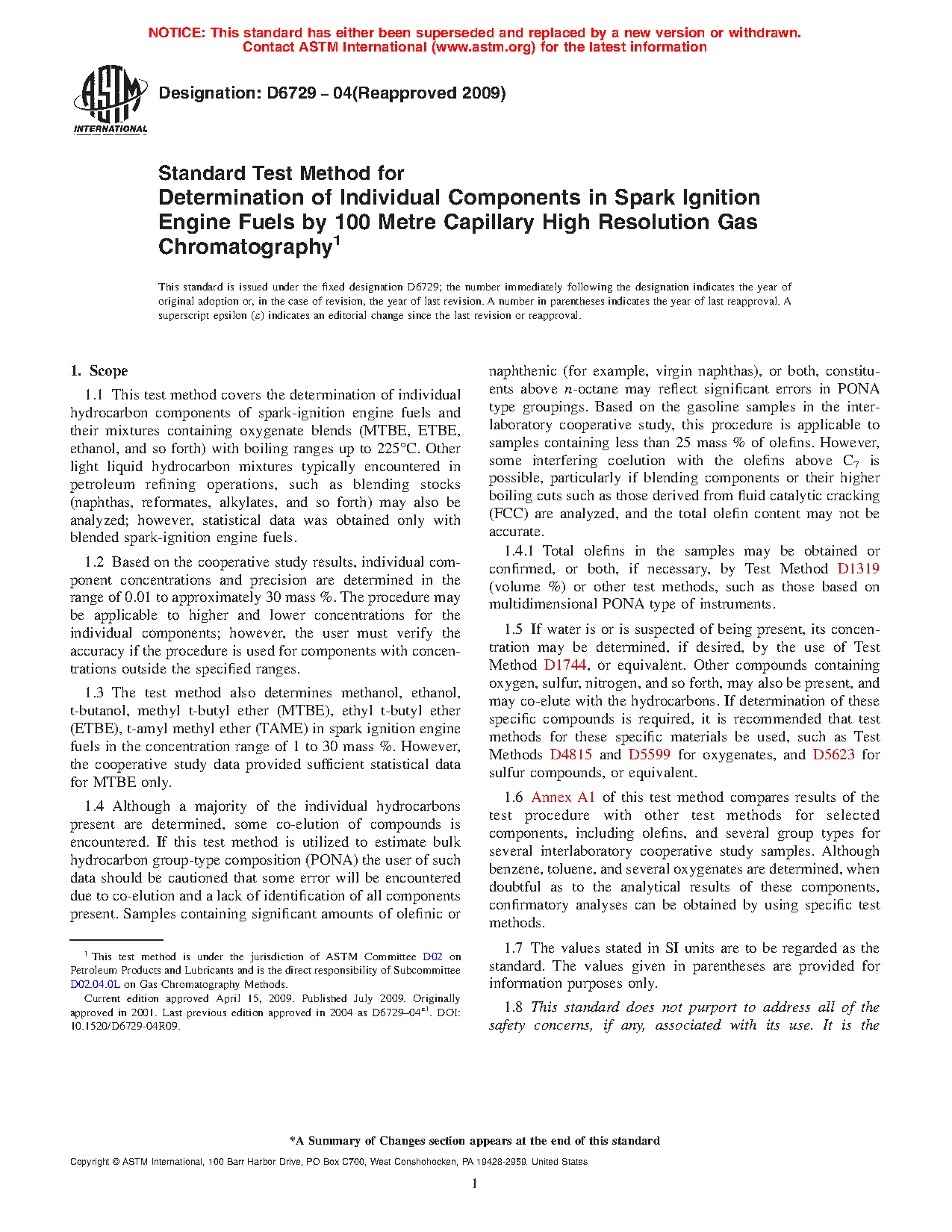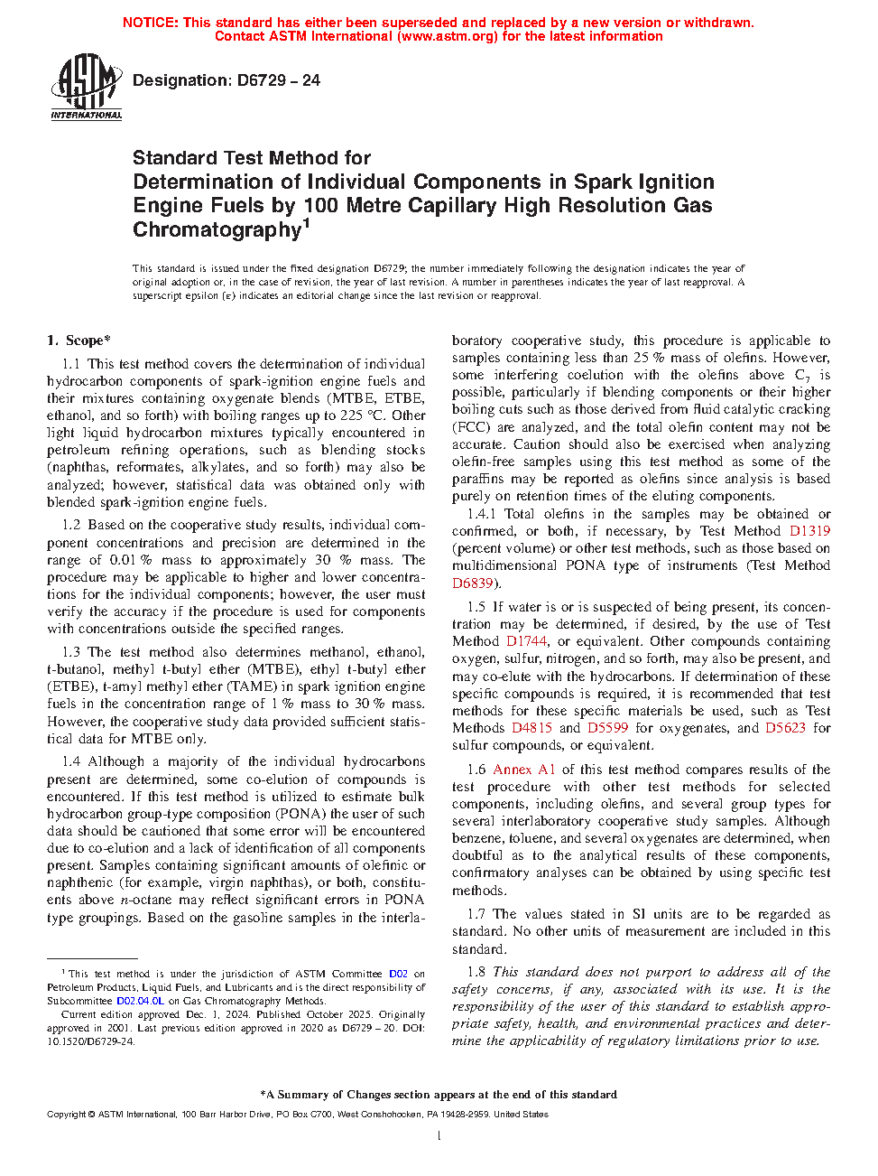 1.1 This test method covers the determination of individual hydrocarbon components of spark-ignition engine fuels and their mixtures containing oxygenate blends (MTBE, ETBE, ethanol, and so forth) with boiling ranges up to 225 °C. Other light liquid hydrocarbon mixtures typically encountered in petroleum refining operations, such as blending stocks (naphthas, reformates, alkylates, and so forth) may also be analyzed; however, statistical data was obtained only with blended spark-ignition engine fuels.