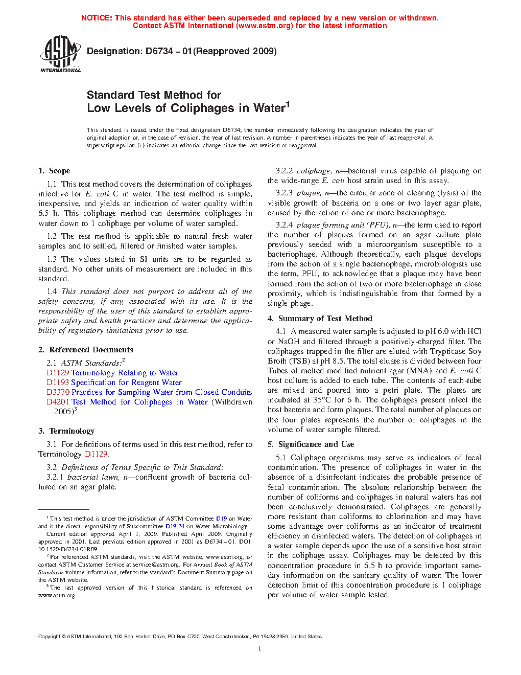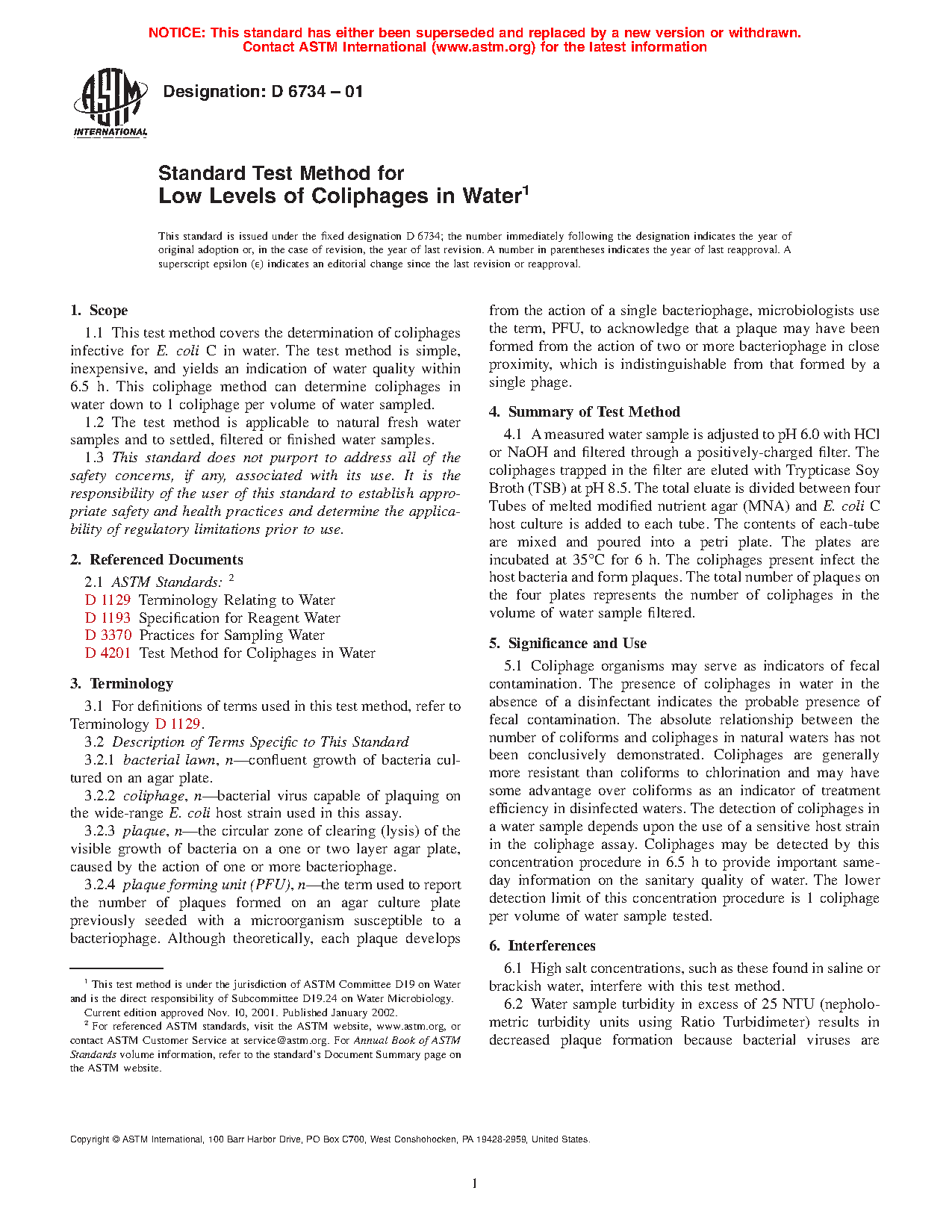 1.1 This test method covers the determination of coliphages infective for E. coli C in water. The test method is simple, inexpensive, and yields an indication of water quality within 6.5 h. This coliphage method can determine coliphages in water down to 1 coliphage per volume of water sampled.