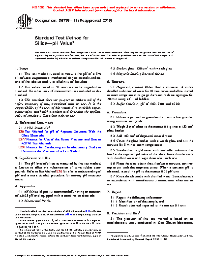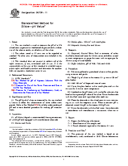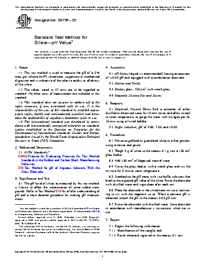 1.1 This test method is used to measure the pH of a 5 % mass per volume (m/V) silica/water suspension or mechanical dispersion and is indicative of the relative acidity or alkalinity of the silica.