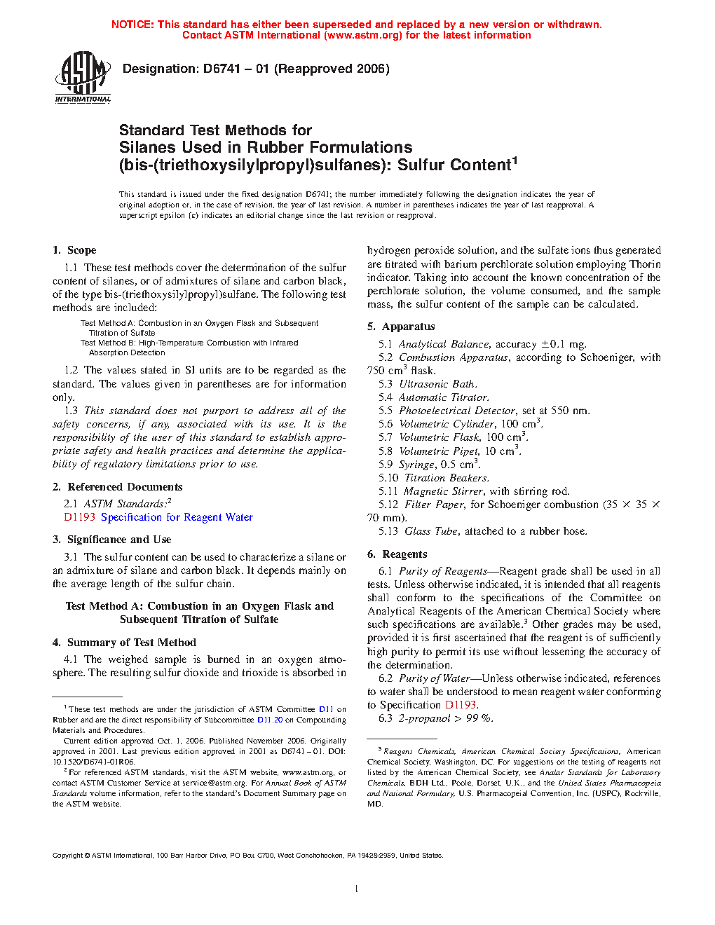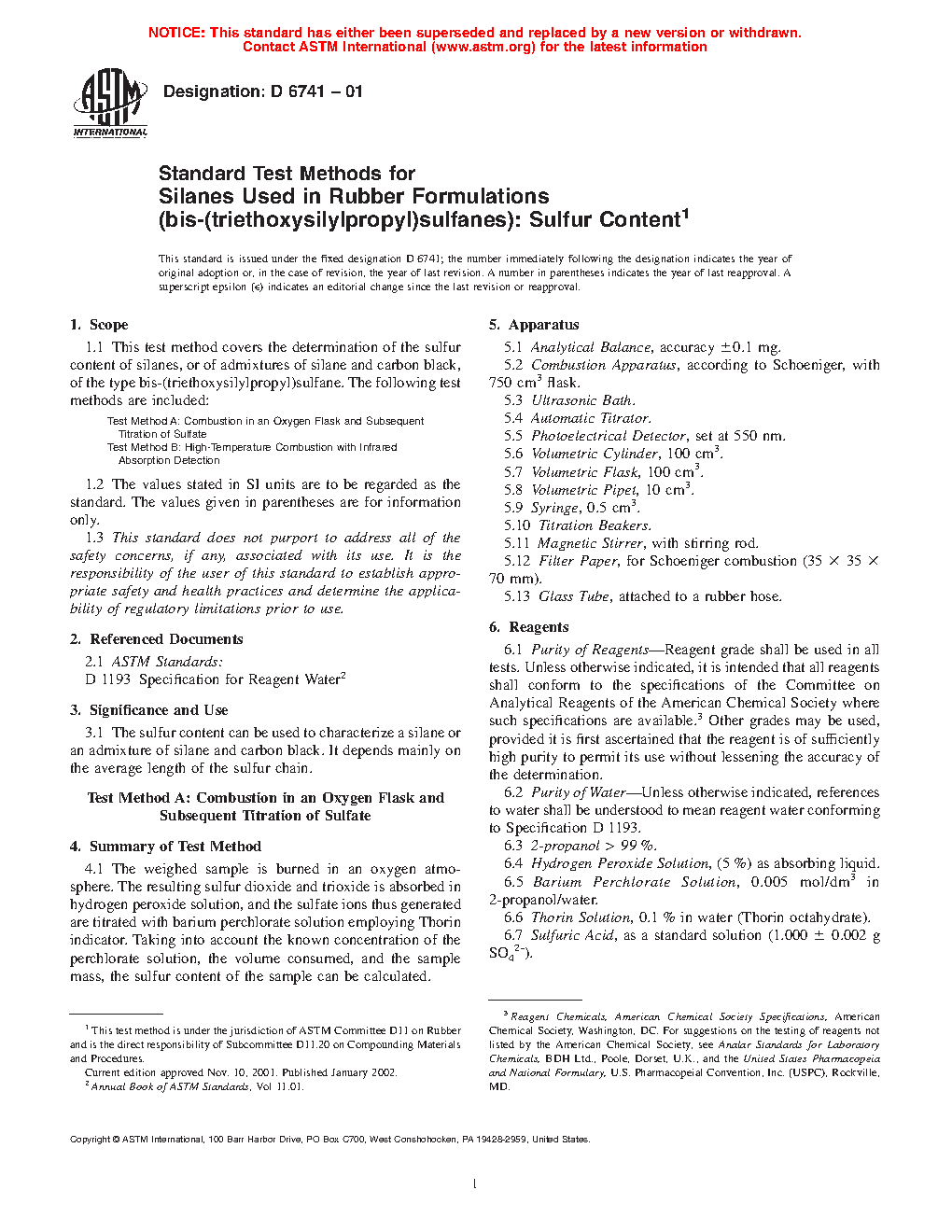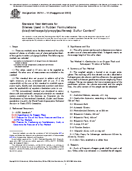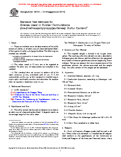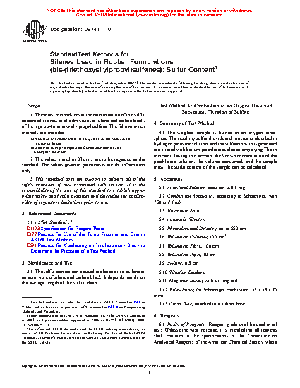 1.1 These test methods cover the determination of the sulfur content of silanes, or of admixtures of silane and carbon black, of the type bis-(triethoxysilylpropyl)sulfane. The following test methods are included: