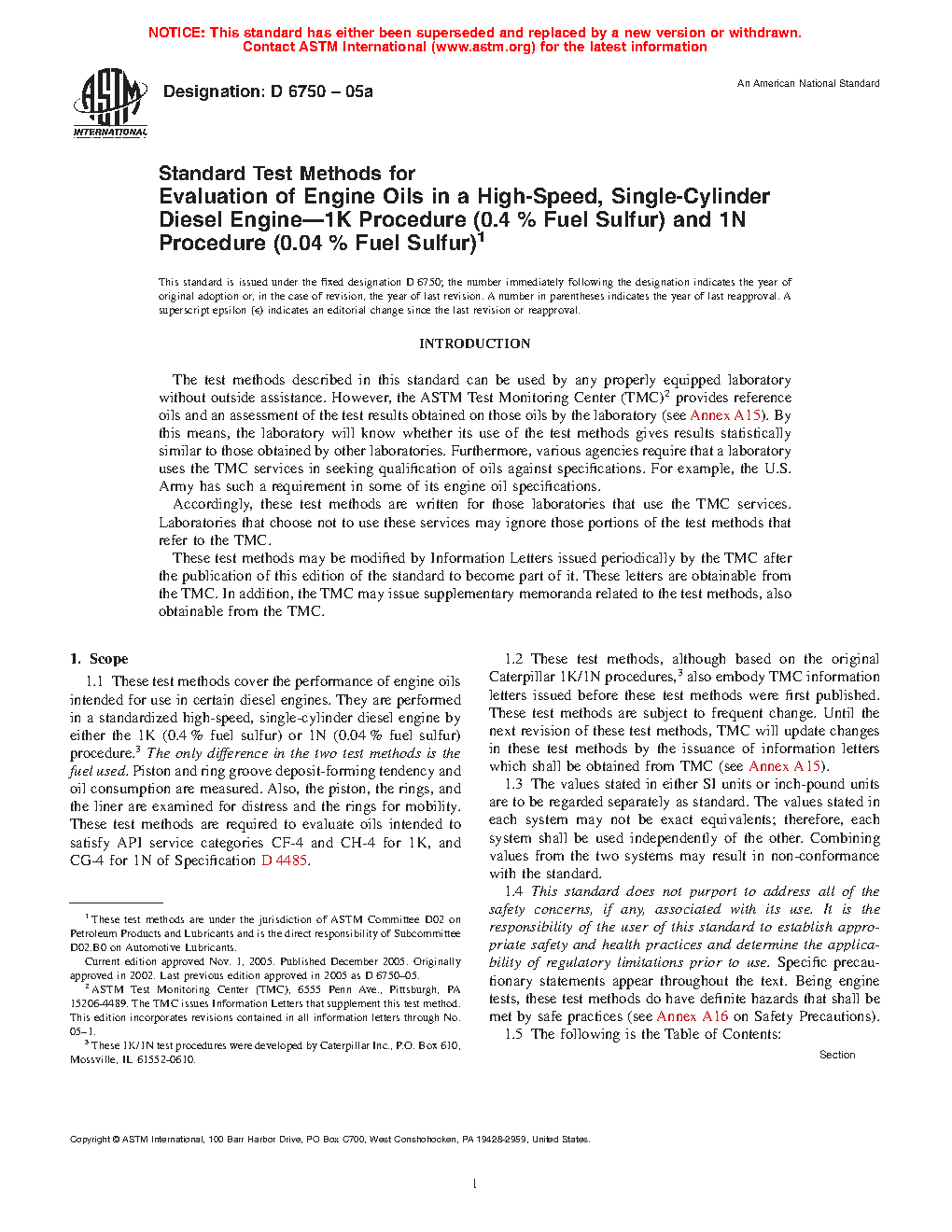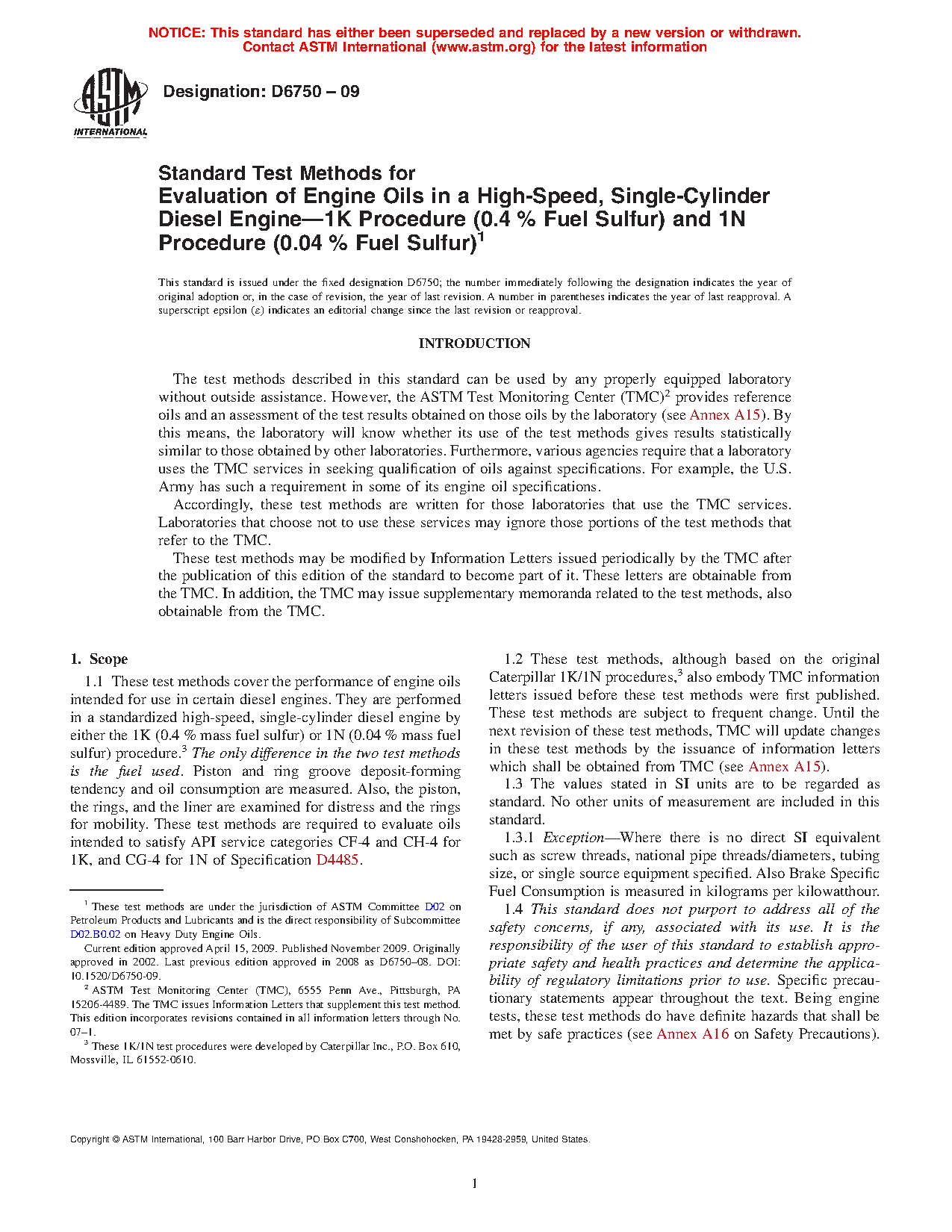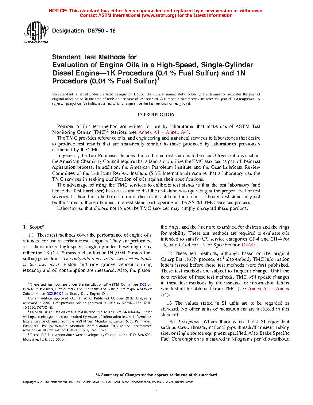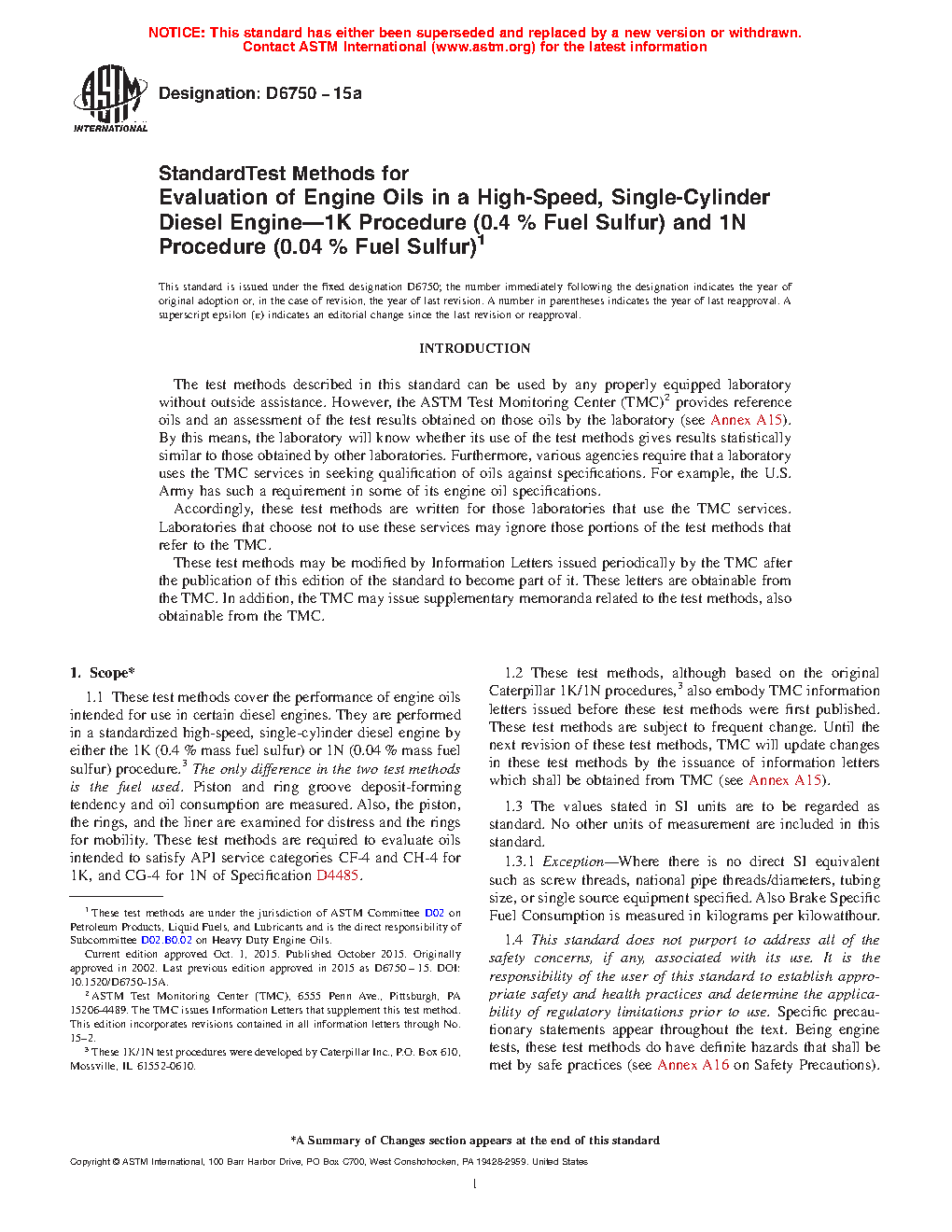 1.2 These test methods, although based on the original Caterpillar 1K/1N procedures,3 also embody TMC information letters issued before these test methods were first published. These test methods are subject to frequent change. Until the next revision of these test methods, TMC will update changes in these test methods by the issuance of information letters which shall be obtained from TMC (see Annex A1 – Annex A4).
