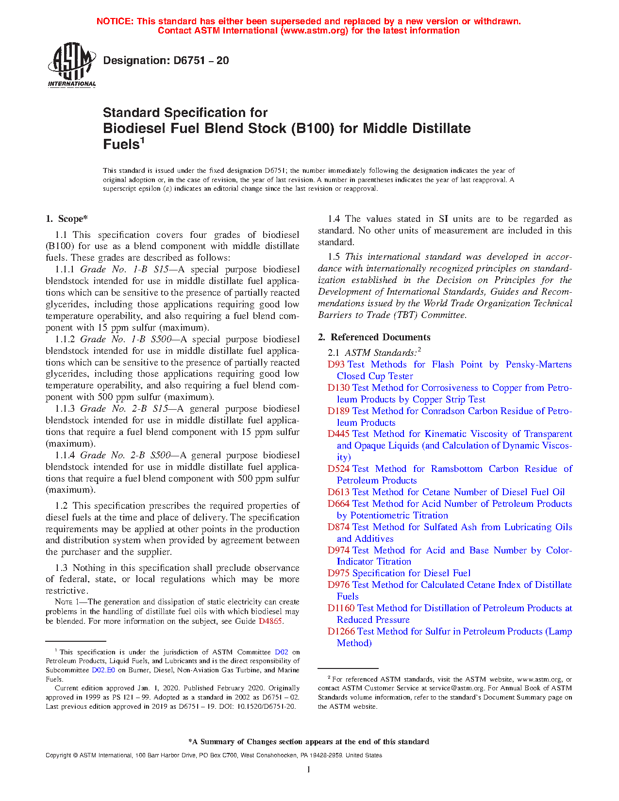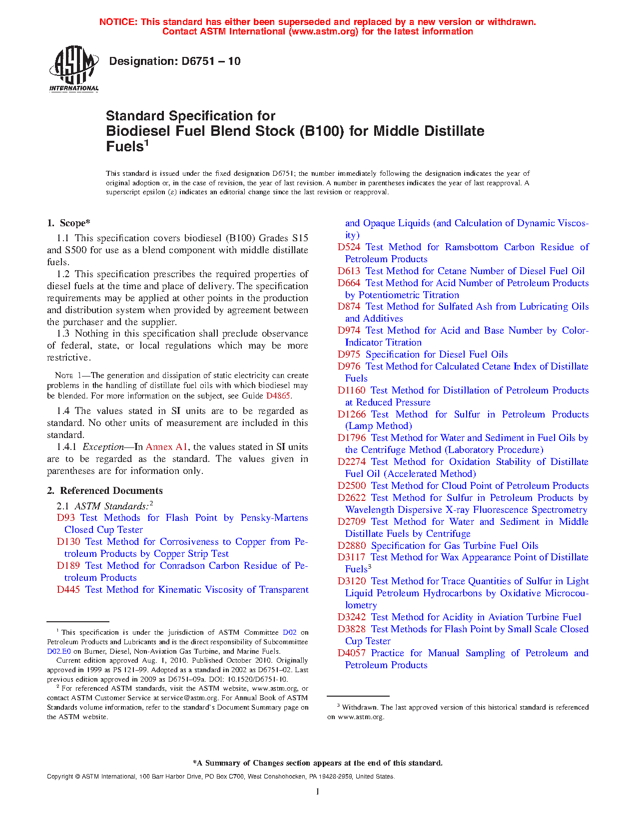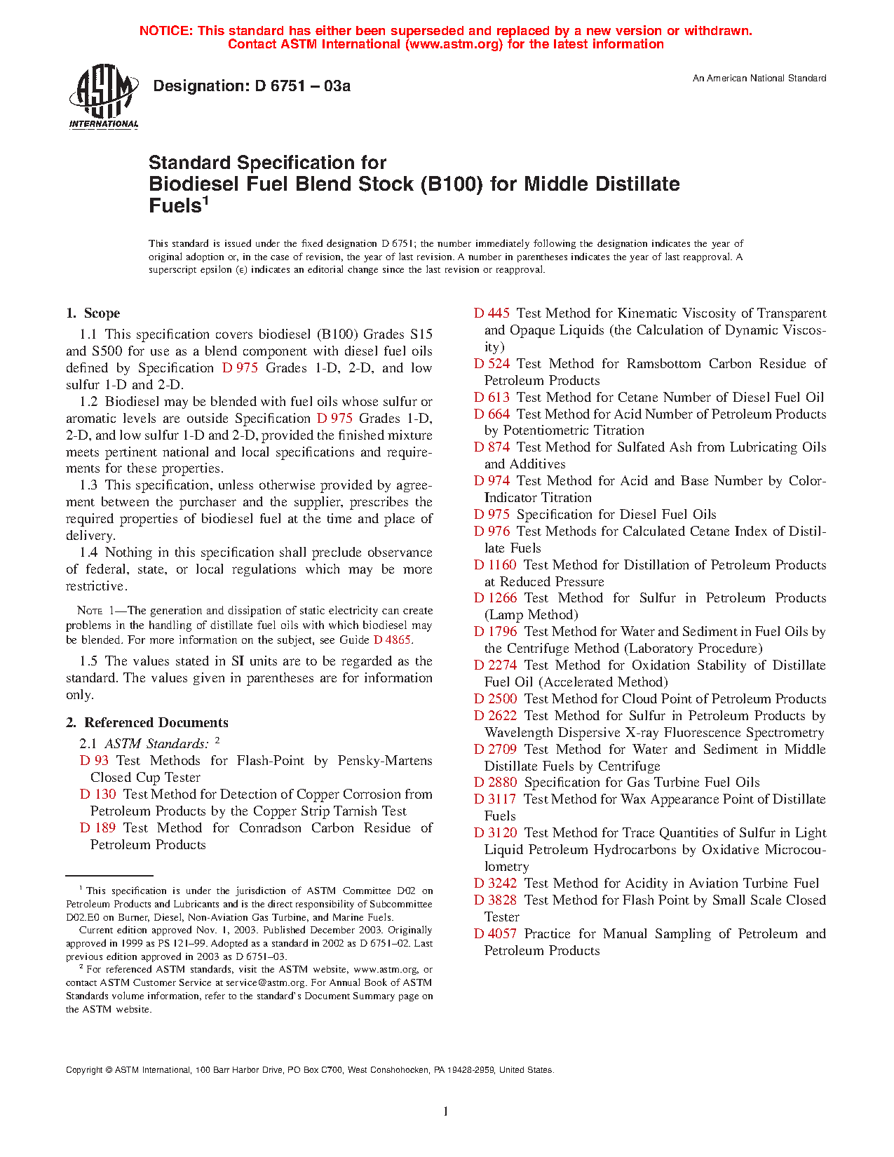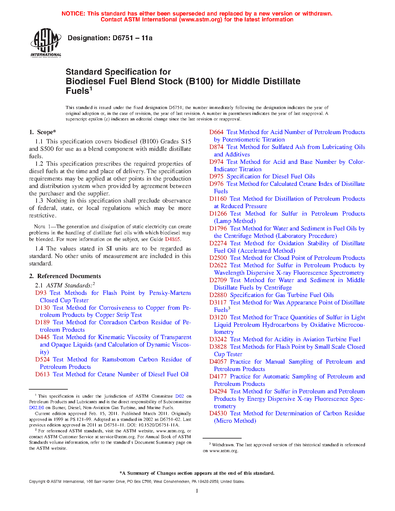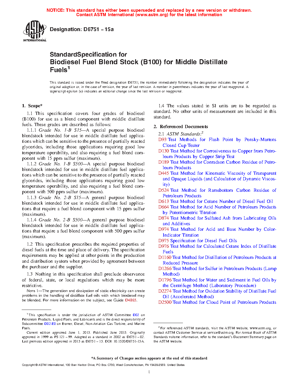 1.1 This specification covers biodiesel (B100) Grades S15 and S500 for use as a blend component with middle distillate fuels.