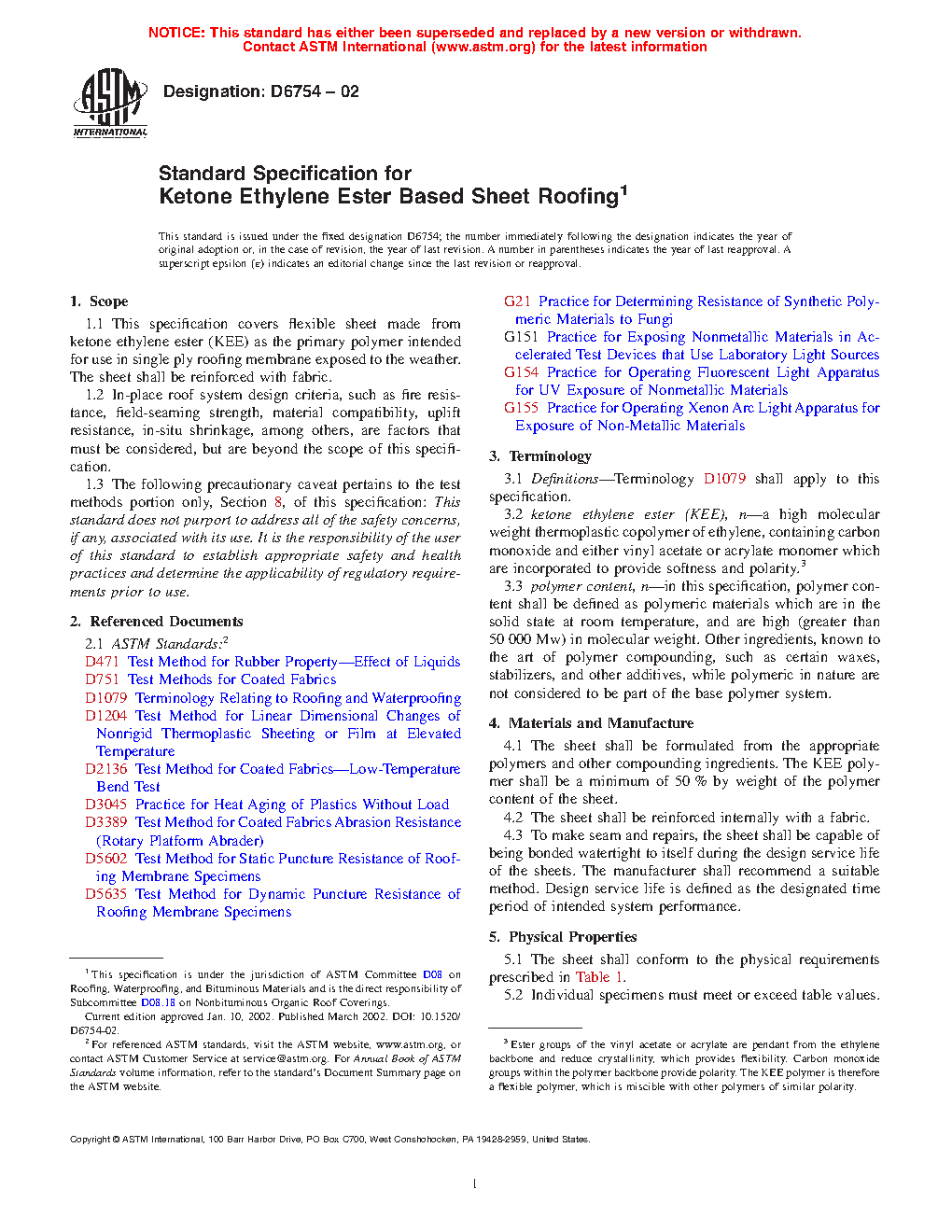 1.1 This specification covers flexible sheet made from ketone ethylene ester (KEE) as the primary polymer intended for use in single ply roofing membrane exposed to the weather. The sheet shall be reinforced with fabric.