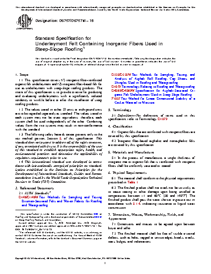 1.1 This specification covers (1) inorganic fiber-reinforced organic felt underlayment and (2) inorganic fiber-based felt for use as underlayment with steep-slope roofing products. The intent of this specification is to provide criteria for producing and evaluating underlayments with a significantly reduced tendency to wrinkle before or after the installation of steep roofing products.