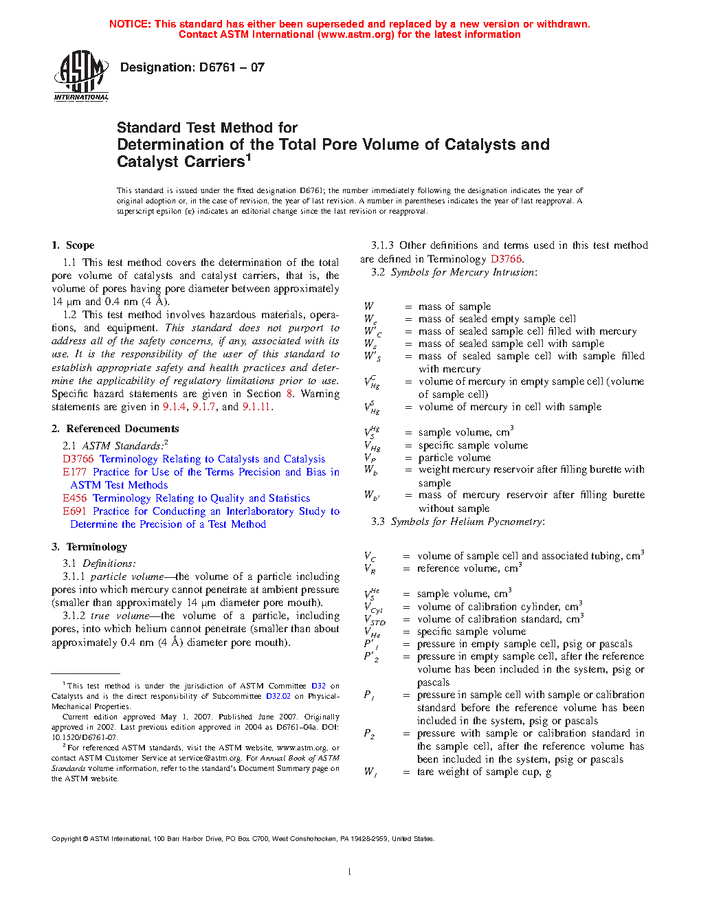 1.1 This test method covers the determination of the total pore volume of catalysts and catalyst carriers, that is, the volume of pores having pore diameter between approximately 14 m and 0.4 to 0.6 nm (4 to 6 Å).
