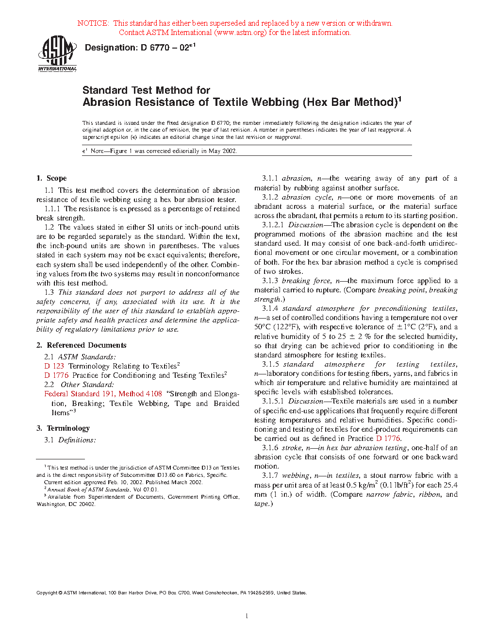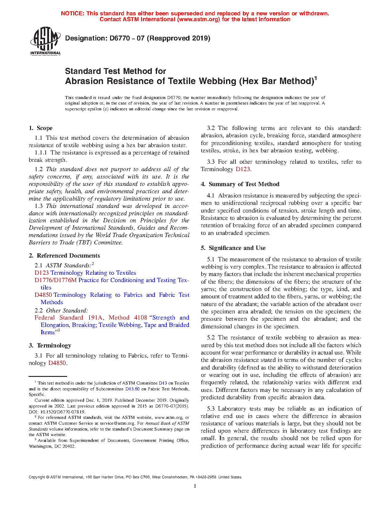 1.1 This test method covers the determination of abrasion resistance of textile webbing using a hex bar abrasion tester.