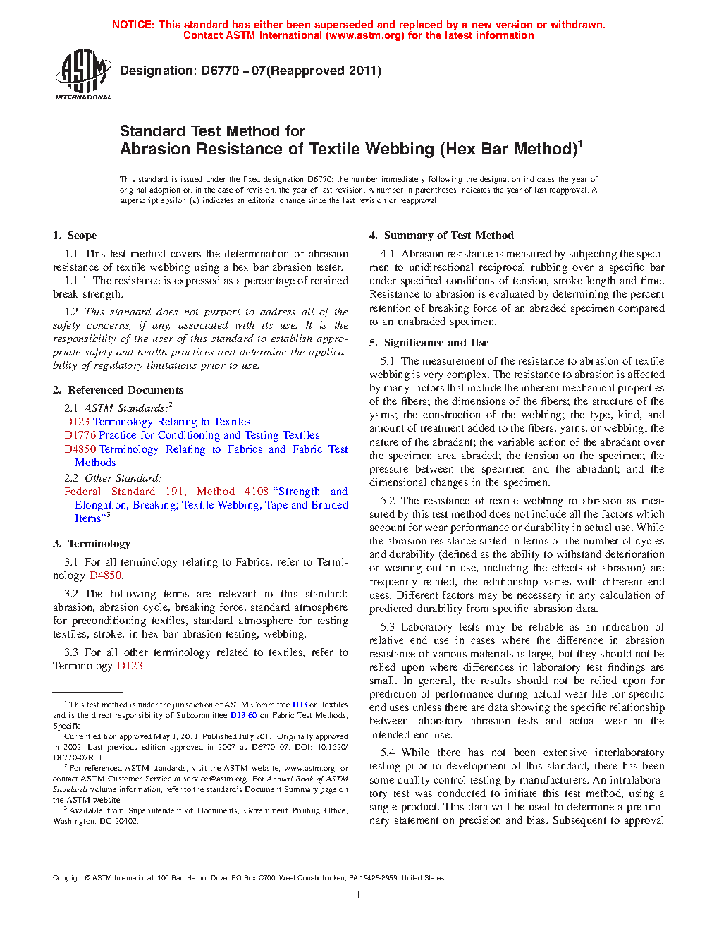 5.2 The resistance of textile webbing to abrasion as measured by this test method does not include all the factors which account for wear performance or durability in actual use. While the abrasion resistance stated in terms of the number of cycles and durability (defined as the ability to withstand deterioration or wearing out in use, including the effects of abrasion) are frequently related, the relationship varies with different end uses. Different factors may be necessary in any calculation of predicted durability from specific abrasion data.