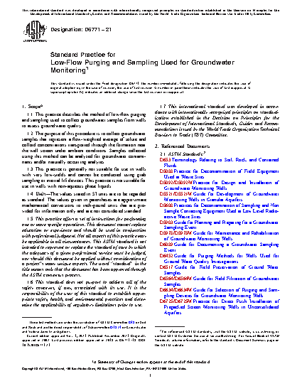 1.1 This practice describes the method of low-flow purging and sampling used to collect groundwater samples from wells to assess groundwater quality.