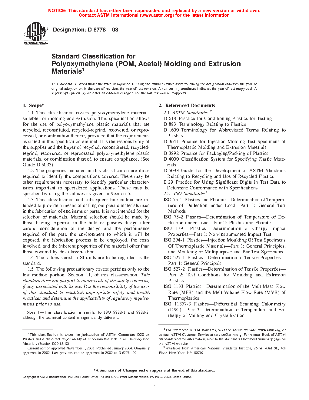 1.1 This classification covers polyoxymethylene materials suitable for molding and extrusion. This specification allows for the use of polyoxymethylene plastic materials that are recycled, reconstituted, recycled-regrind, recovered, or reprocessed, or combination thereof, provided that the requirements as stated in this specification are met. It is the responsibility of the supplier and the buyer of recycled, reconstituted, recycled-regrind, recovered, or reprocessed polyoxymethylene plastic materials, or combination thereof, to ensure compliance. (See Guide D 5033).