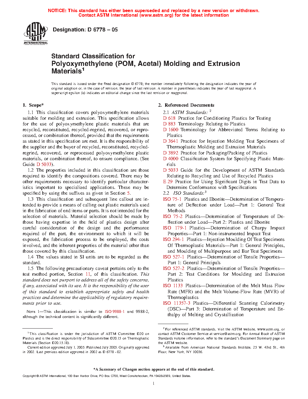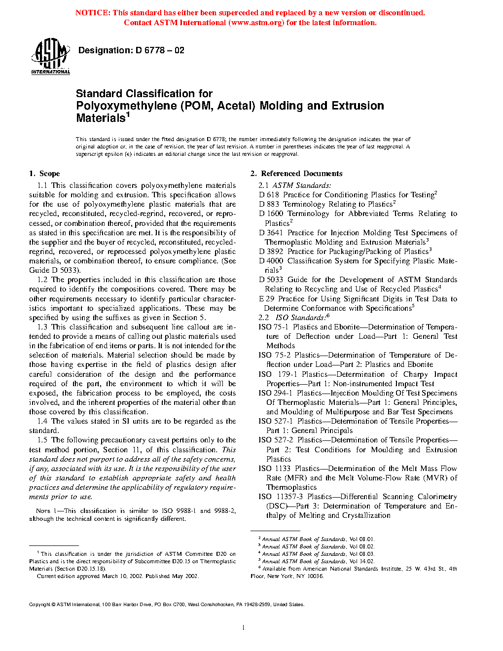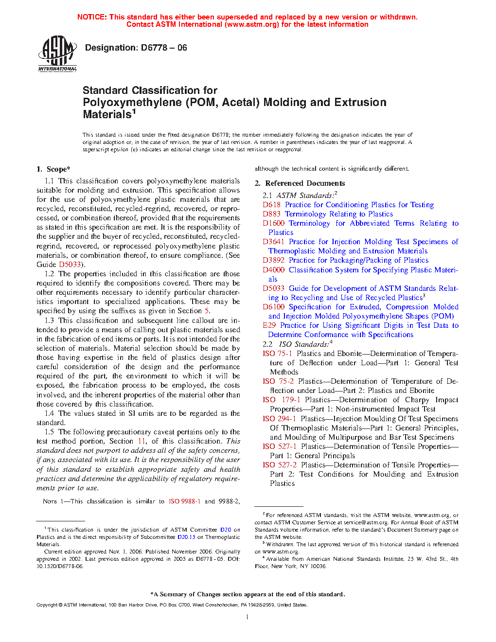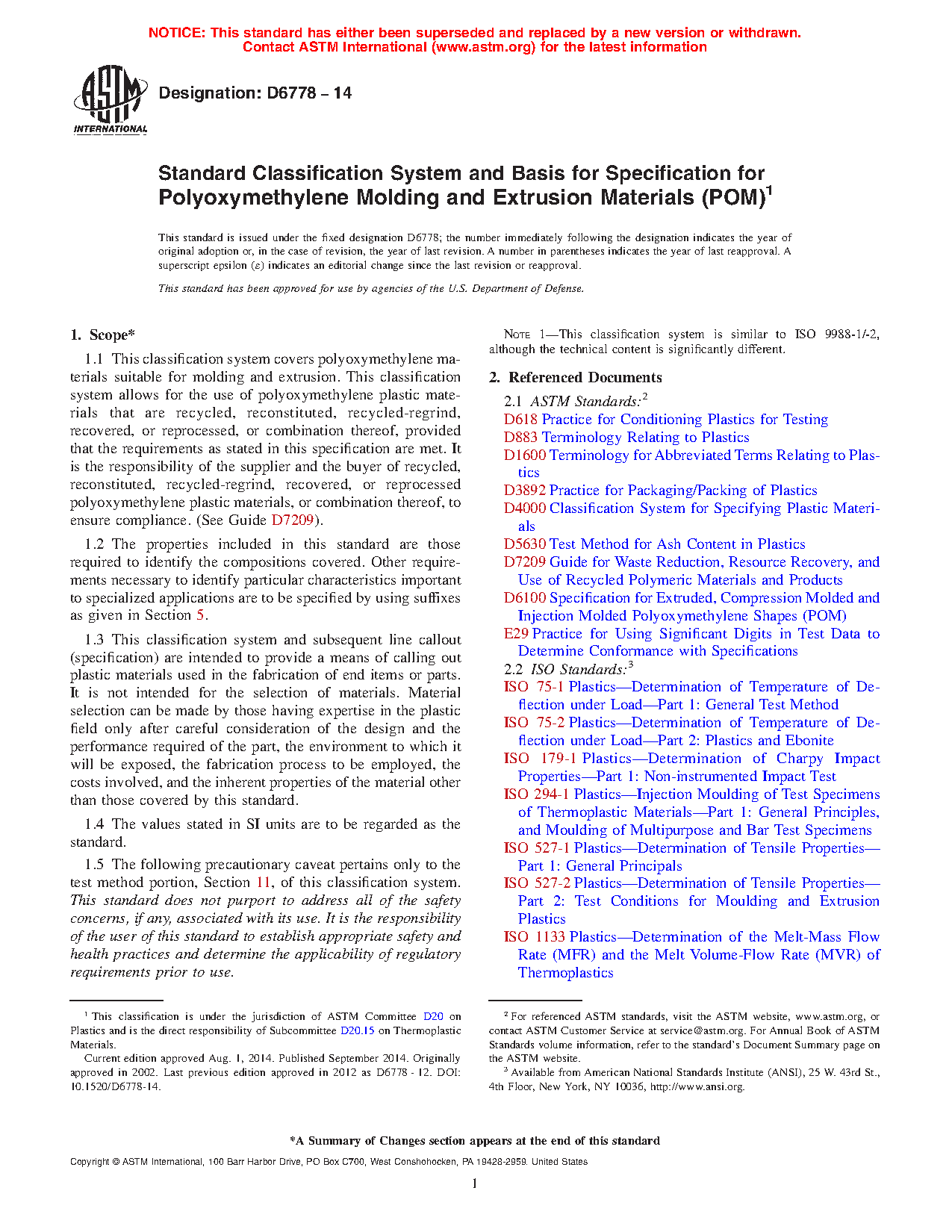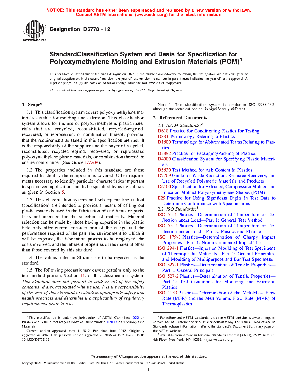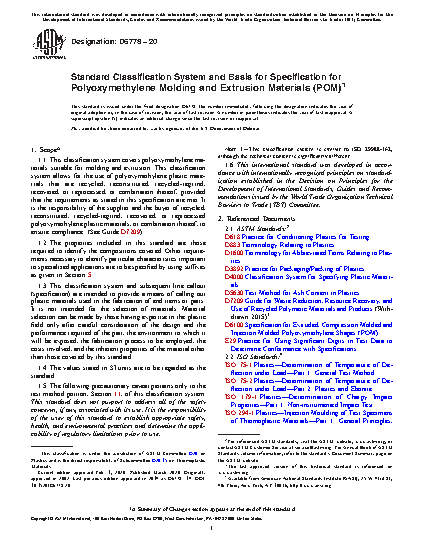 1.1 This classification system covers polyoxymethylene materials suitable for molding and extrusion. This classification system allows for the use of polyoxymethylene plastic materials that are recycled, reconstituted, recycled-regrind, recovered, or reprocessed, or combination thereof, provided that the requirements as stated in this specification are met. It is the responsibility of the supplier and the buyer of recycled, reconstituted, recycled-regrind, recovered, or reprocessed polyoxymethylene plastic materials, or combination thereof, to ensure compliance. (See Guide D7209).