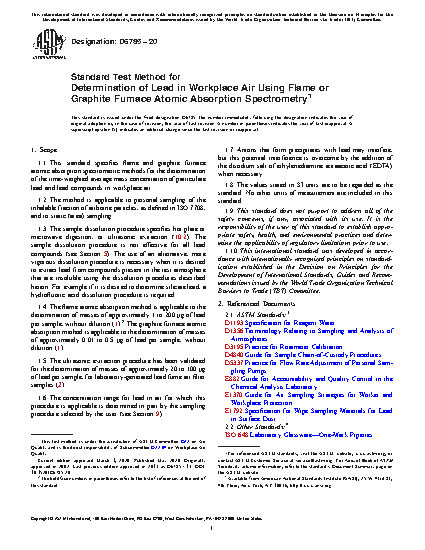1.1 This standard specifies flame and graphite furnace atomic absorption spectrometric methods for the determination of the time-weighted average mass concentration of particulate lead and lead compounds in workplace air.