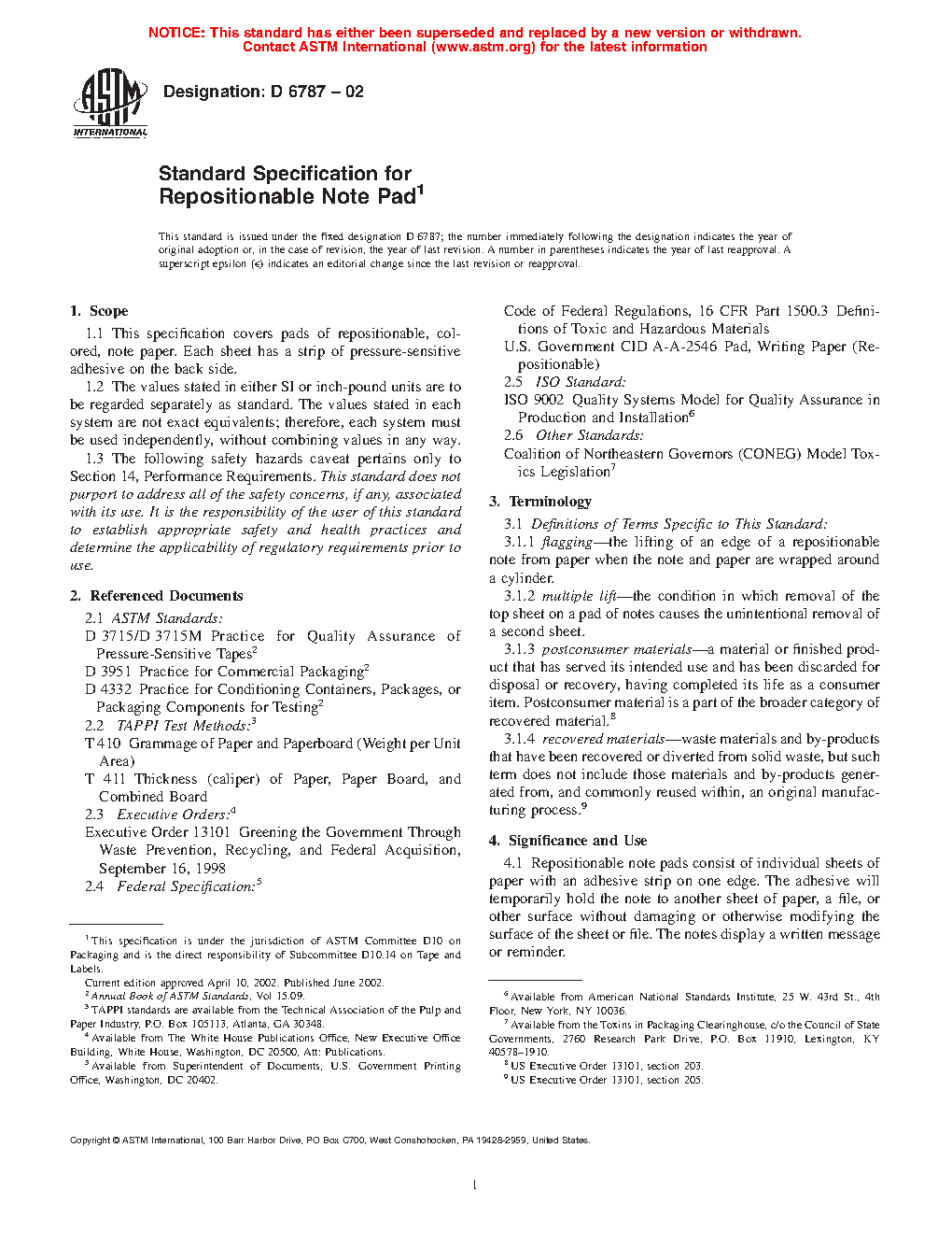 1.1 This specification covers pads of repositionable, colored, note paper. Each sheet has a strip of pressure-sensitive adhesive on the back side.