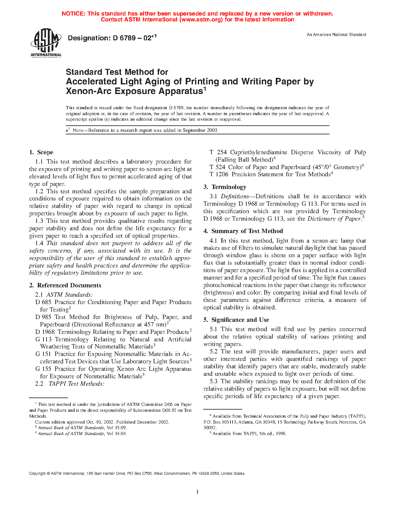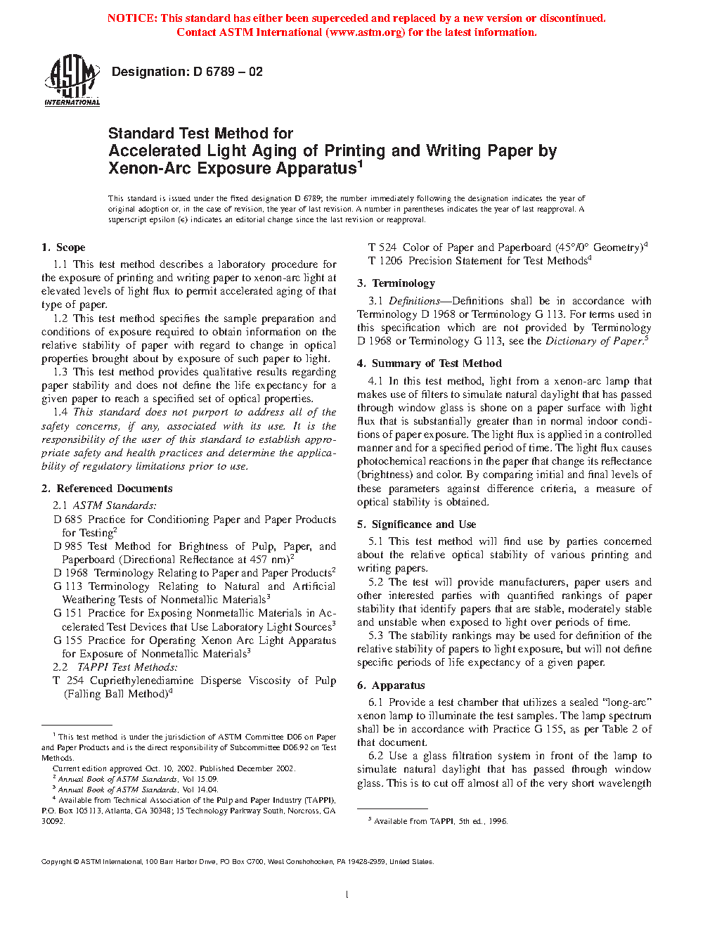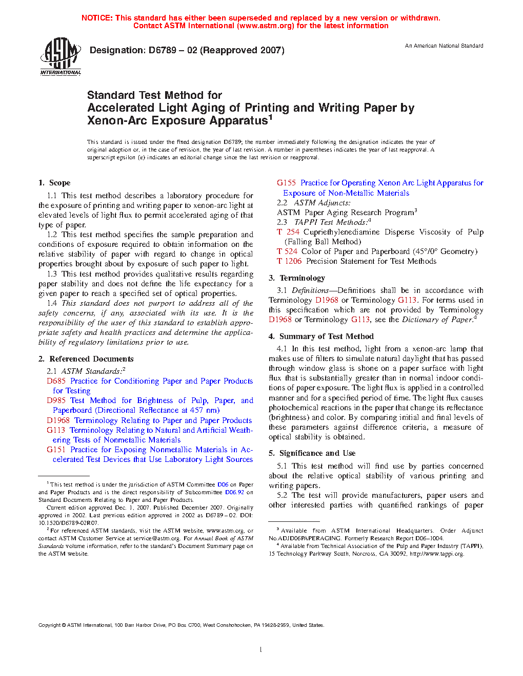 1.1 This test method describes a laboratory procedure for the exposure of printing and writing paper to xenon-arc light at elevated levels of light flux to permit accelerated aging of that type of paper.