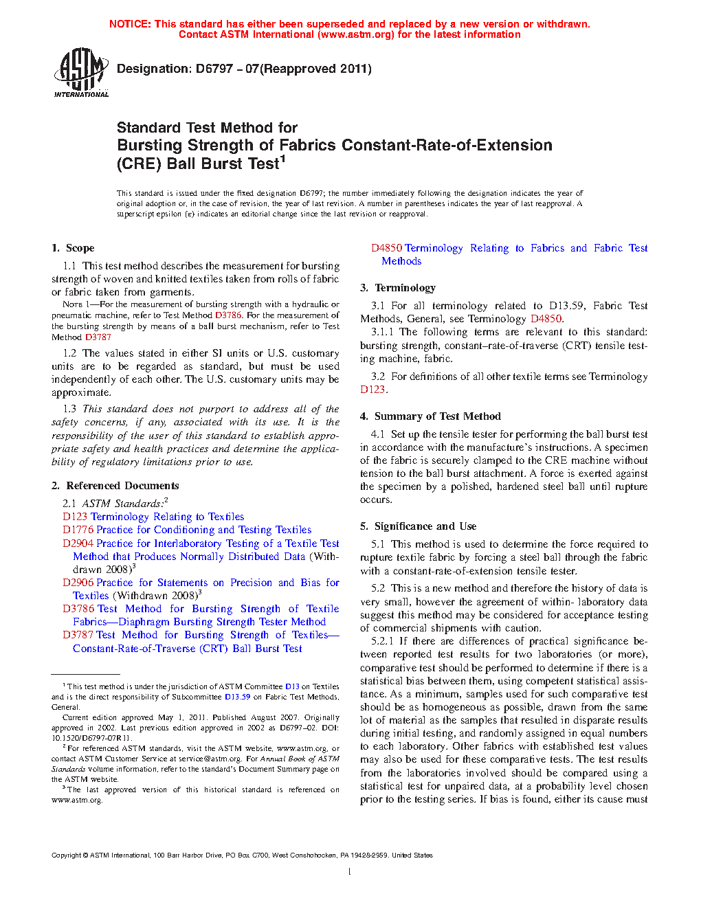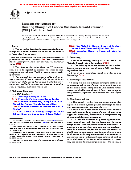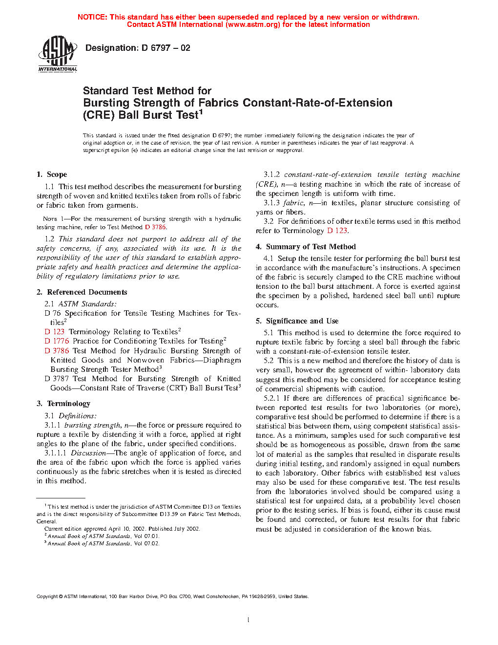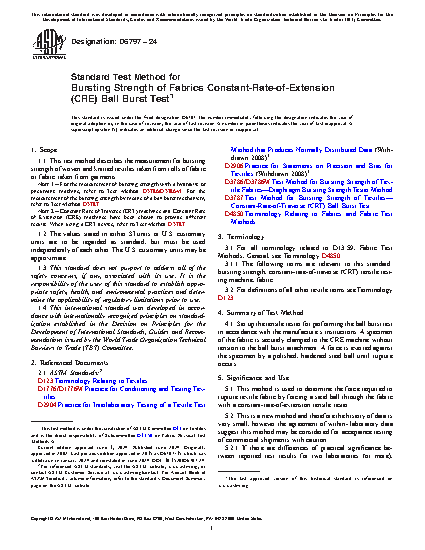 1.1 This test method describes the measurement for bursting strength of woven and knitted textiles taken from rolls of fabric or fabric taken from garments.