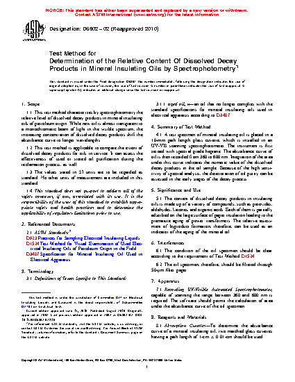 1.2 This test method is applicable to compare the extent of dissolved decay products for oils in service. It can assess the effectiveness of used or stored oil purification during the reclamation process, as well.