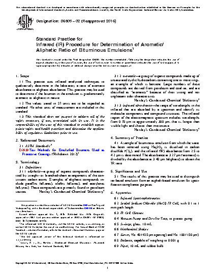 1.1 This practice uses infrared analytical techniques to qualitatively determine in the laboratory a ratio of aromatic absorbance to aliphatic absorbance. This practice may be used to determine if the bitumen in the emulsion is predominantly aromatic or aliphatic in nature.