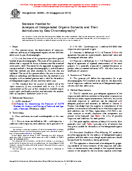 1.1 This practice covers the determination of impurities, stabilizers and assay of halogenated organic solvents and their admixtures by gas chromatography.