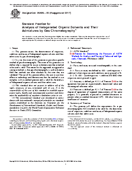1.1 This practice covers the determination of impurities, stabilizers and assay of halogenated organic solvents and their admixtures by gas chromatography.