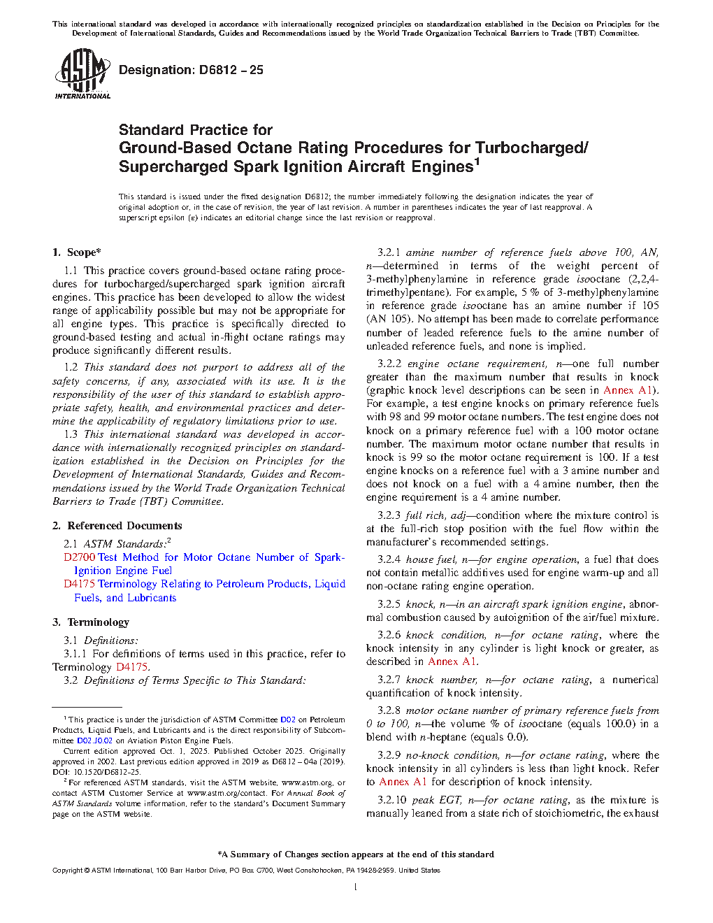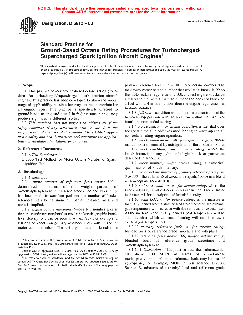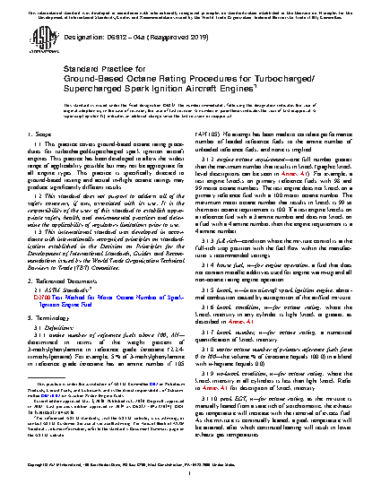 1.1 This practice covers ground-based octane rating procedures for turbocharged/supercharged spark ignition aircraft engines. This practice has been developed to allow the widest range of applicability possible but may not be appropriate for all engine types. This practice is specifically directed to ground-based testing and actual in-flight octane ratings may produce significantly different results.