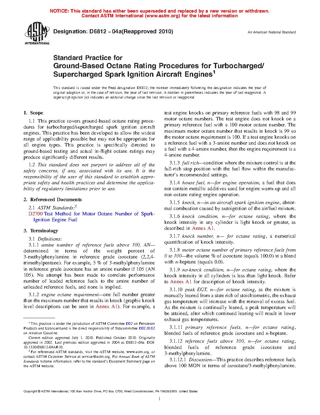 5.1 This practice is used as a basis for determining the minimum ground-based octane requirement of turbocharged/supercharged aircraft engines by use of PRFs and RFs.